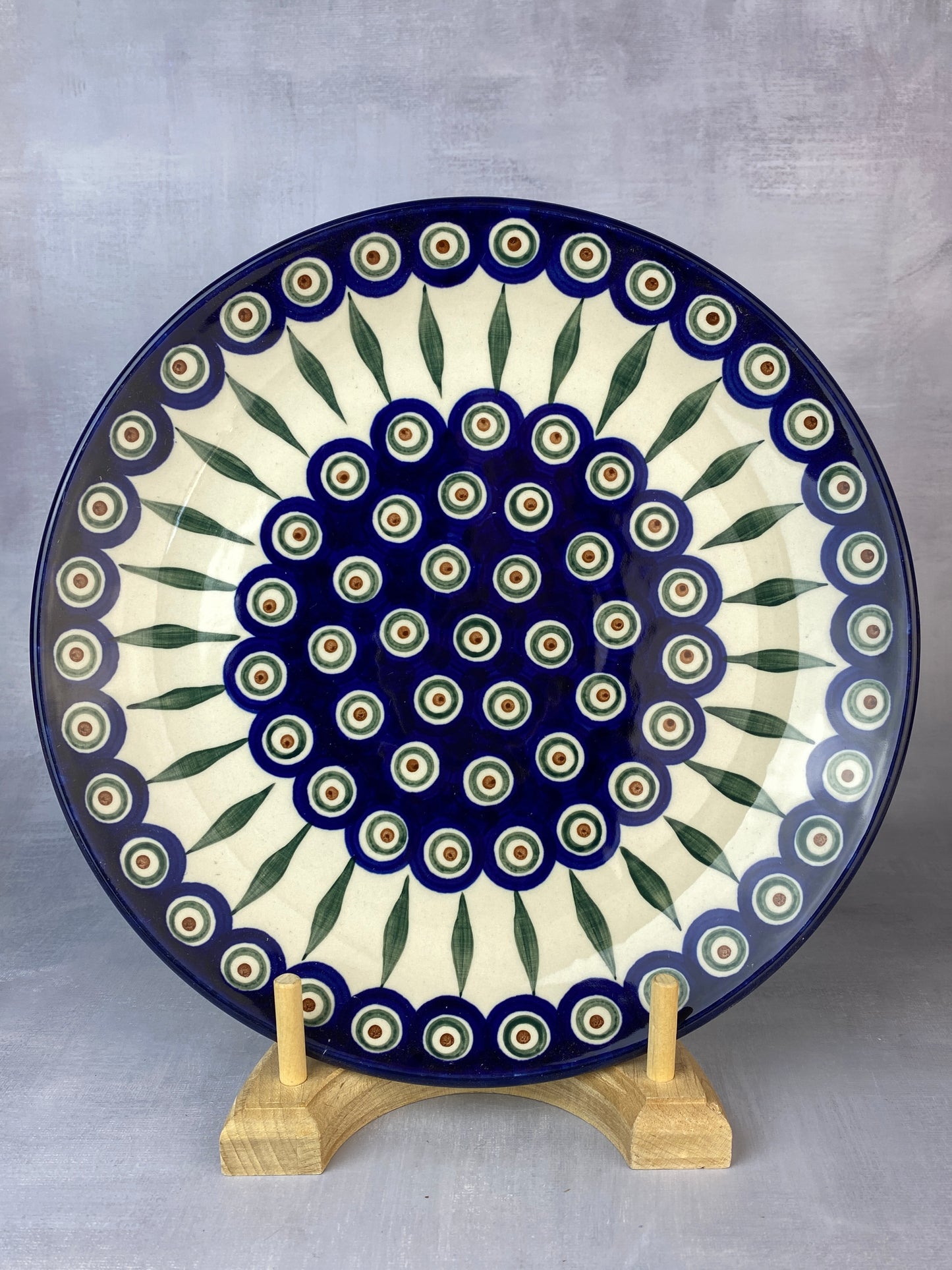 This plate has a 10.5" diameter. It does not have holes in the back for hanging. Like all Polish Pottery, this plate is oven, microwave, and dishwasher safe.