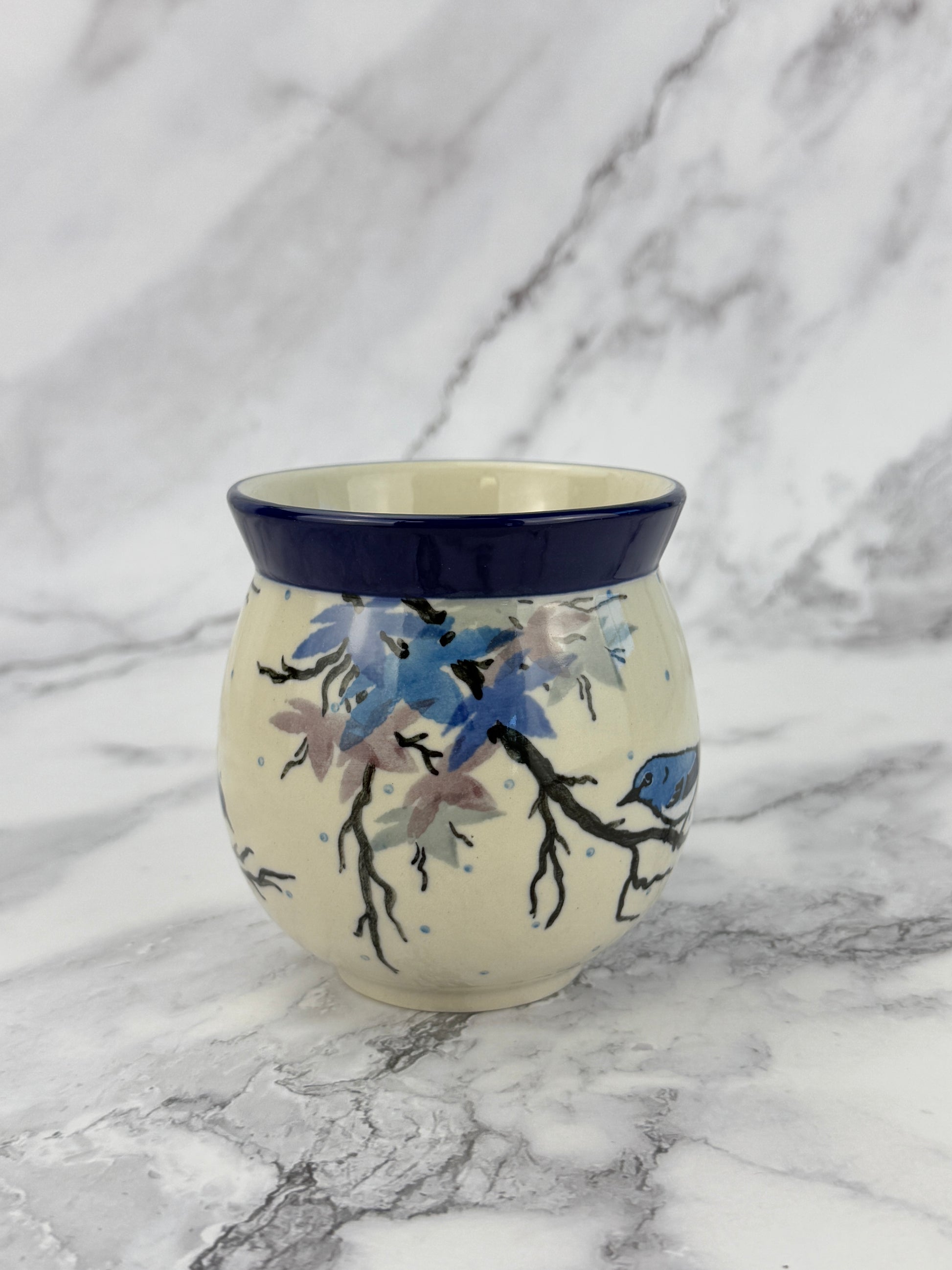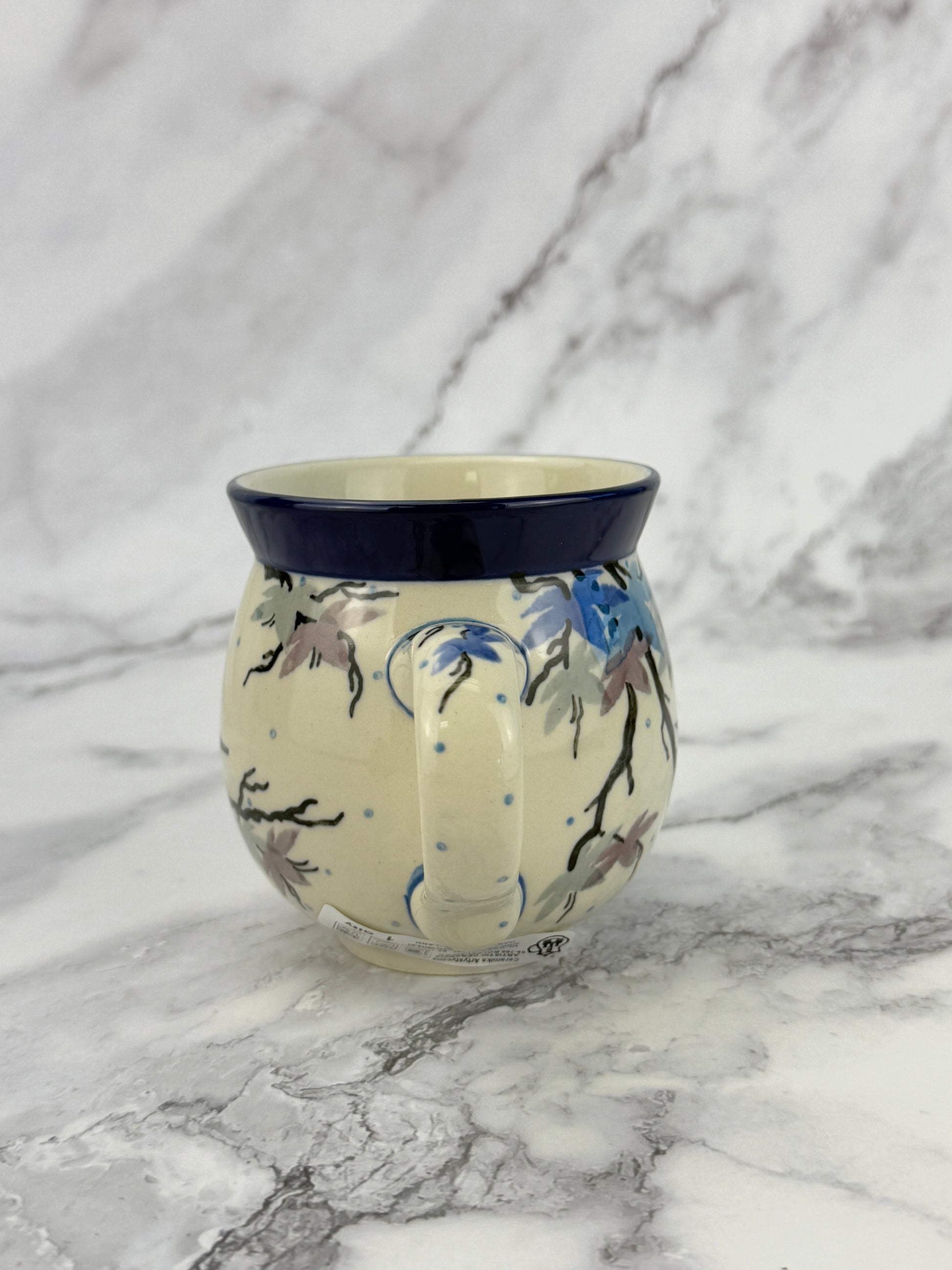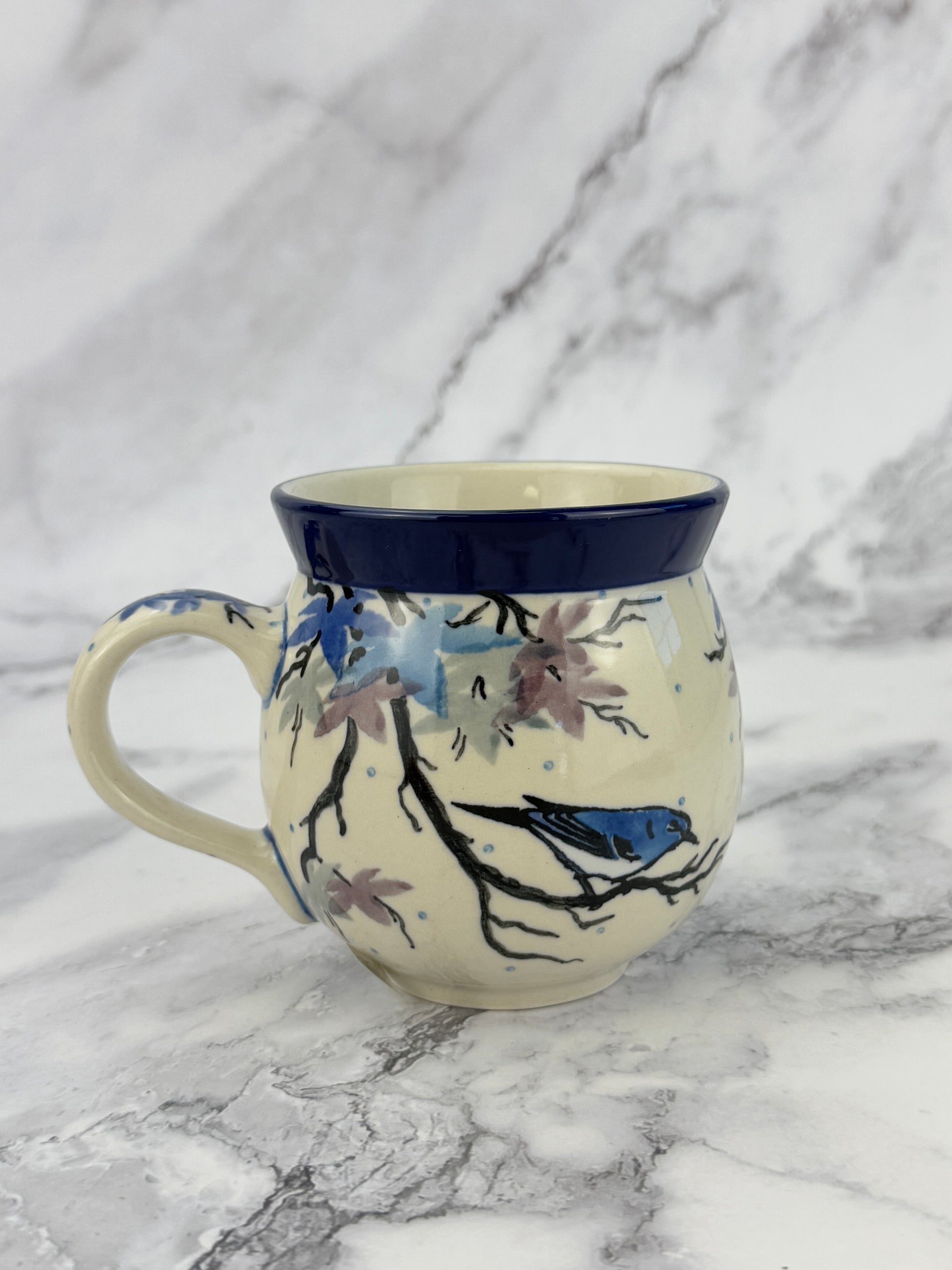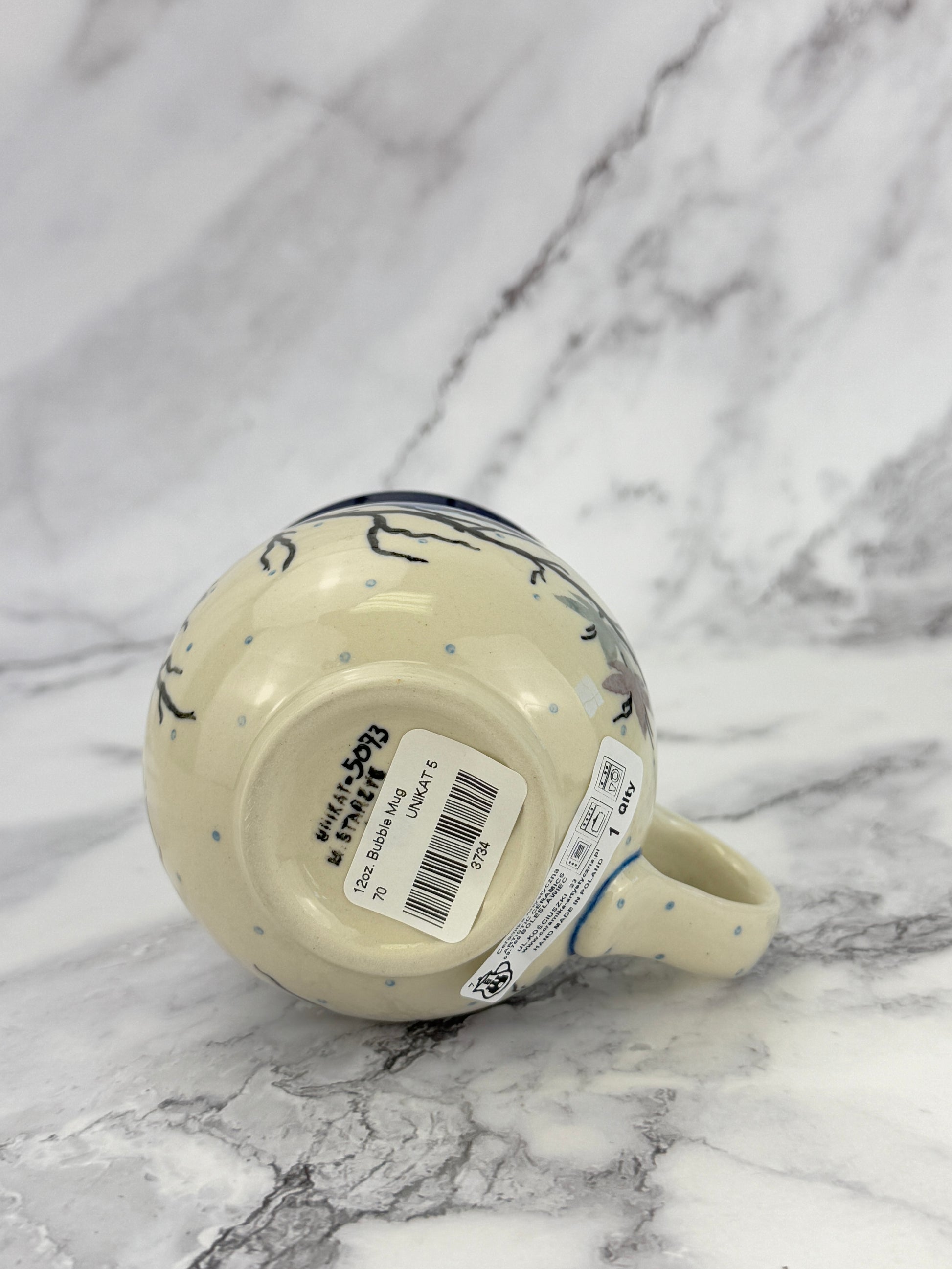 A lovely 12oz bubble mug, perfect for everyday use. This mug stands 3.75" tall and is 5" wide from the edge of the handle.