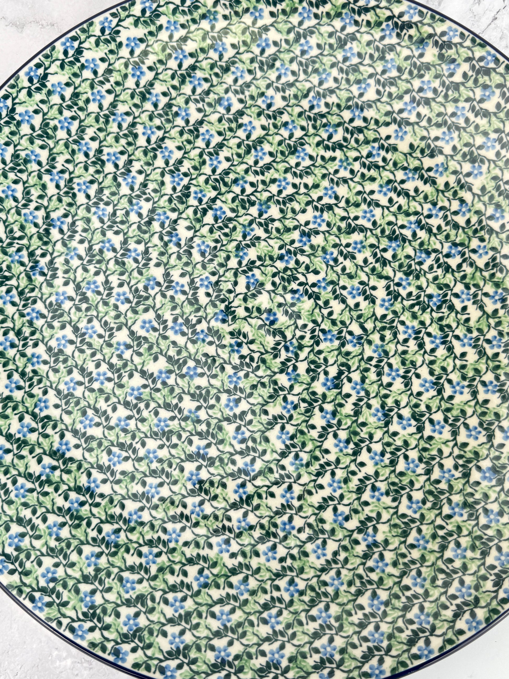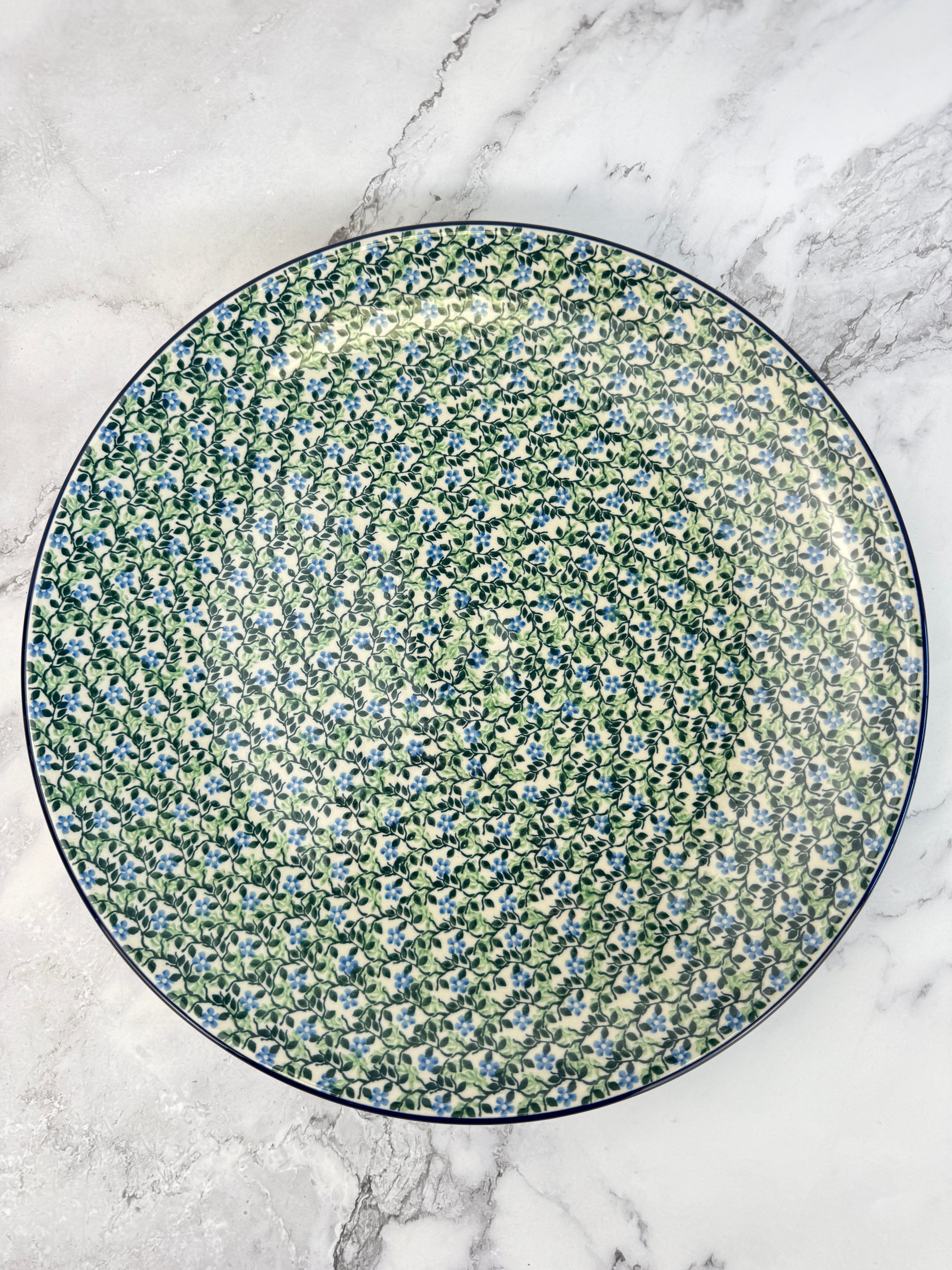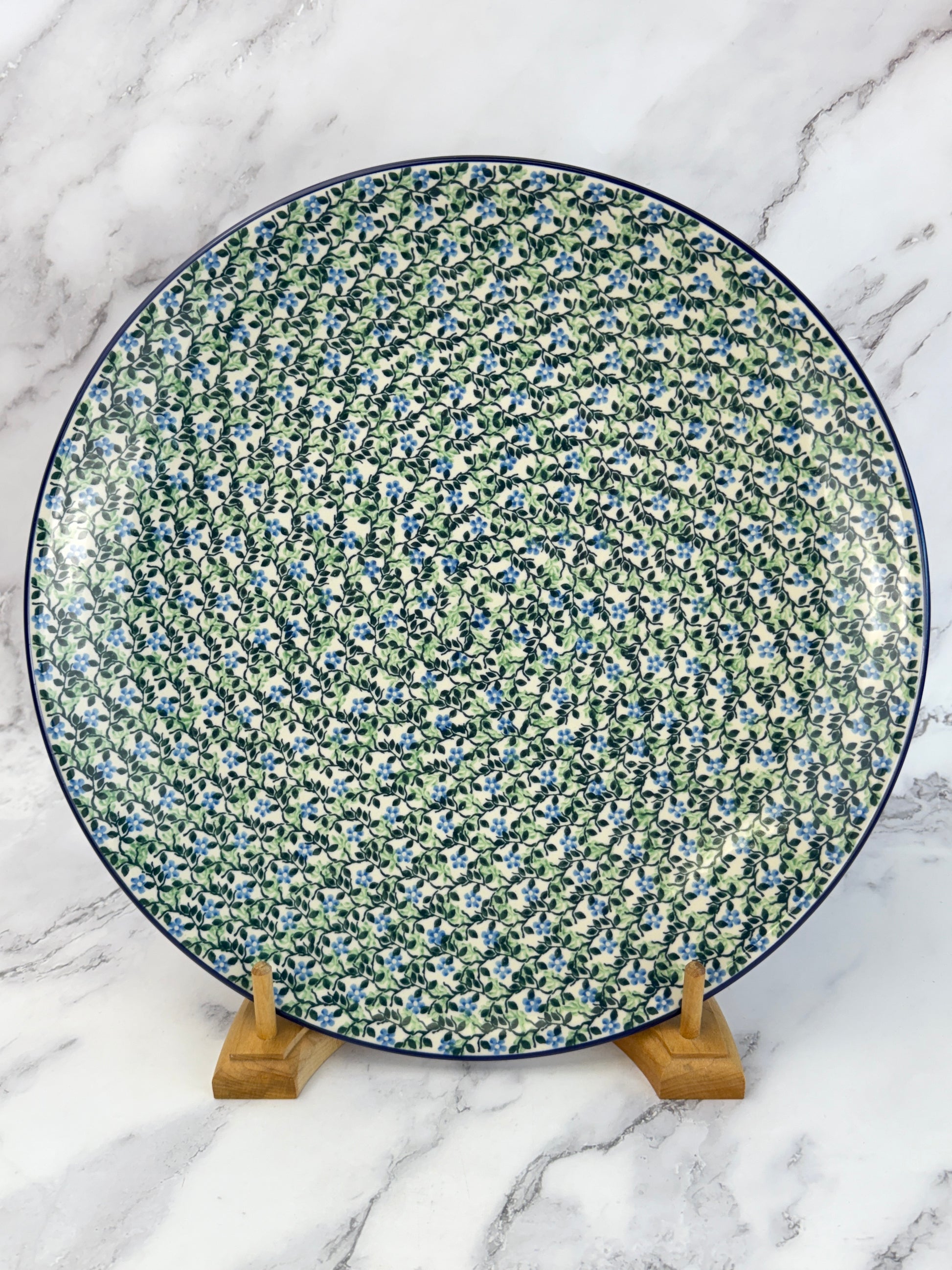 This gorgeous platter measures 14” in diameter and sits 1.7” off the ground. A true showstopping piece. The platter features two holes on the back for hanging.