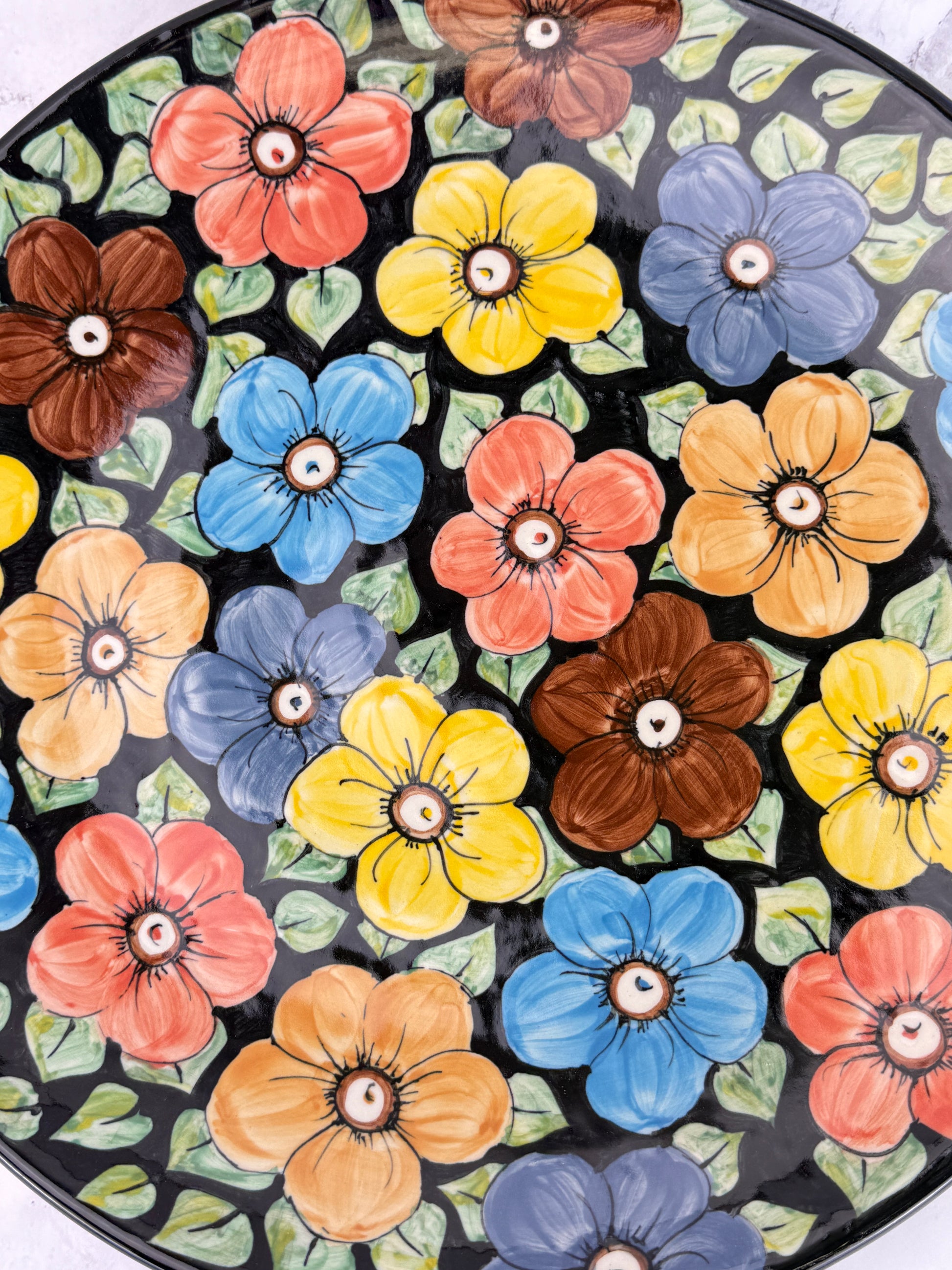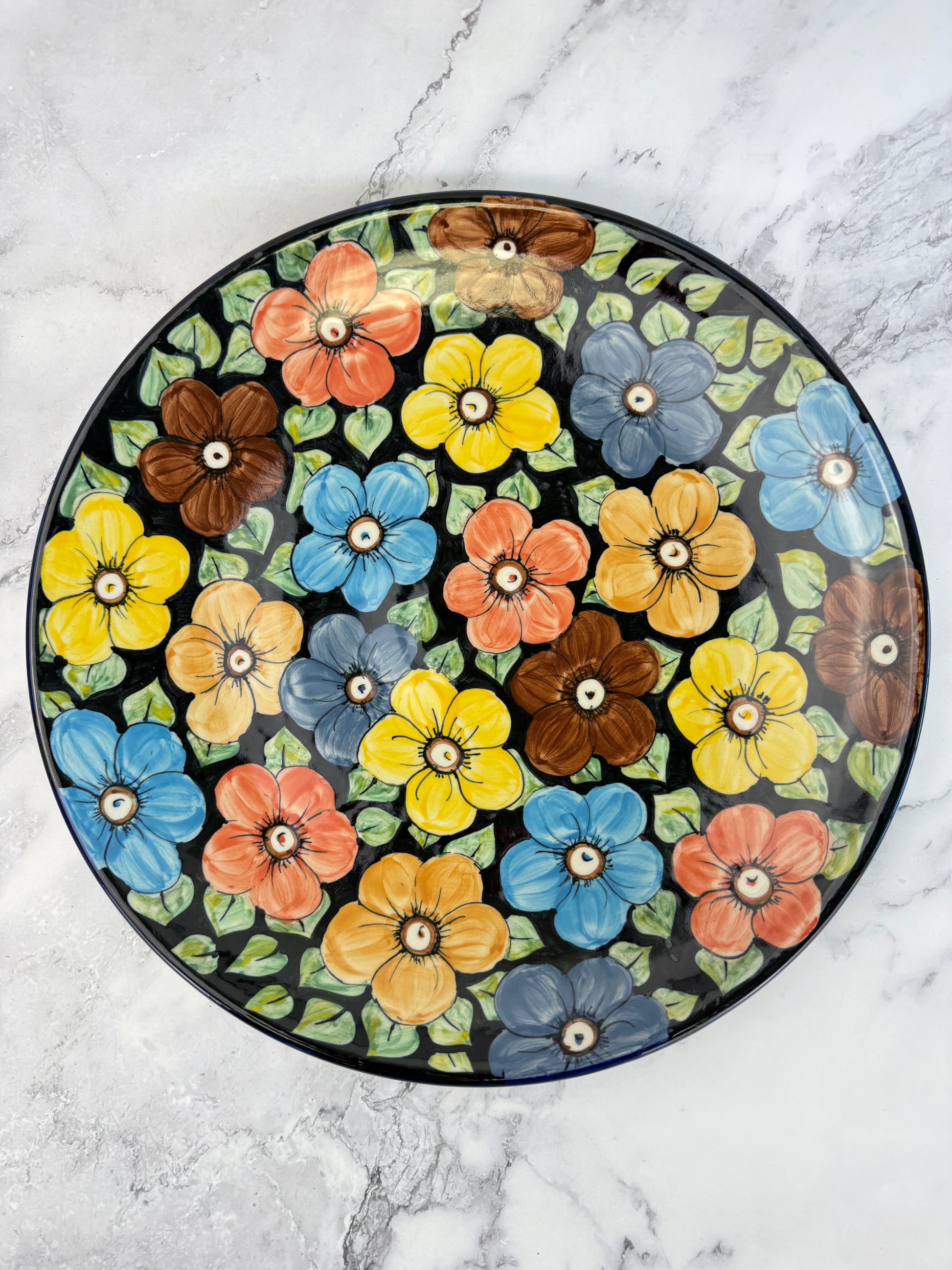This gorgeous platter measures 14” in diameter and sits 1.7” off the ground. A true showstopping piece. The platter features two holes on the back for hanging.