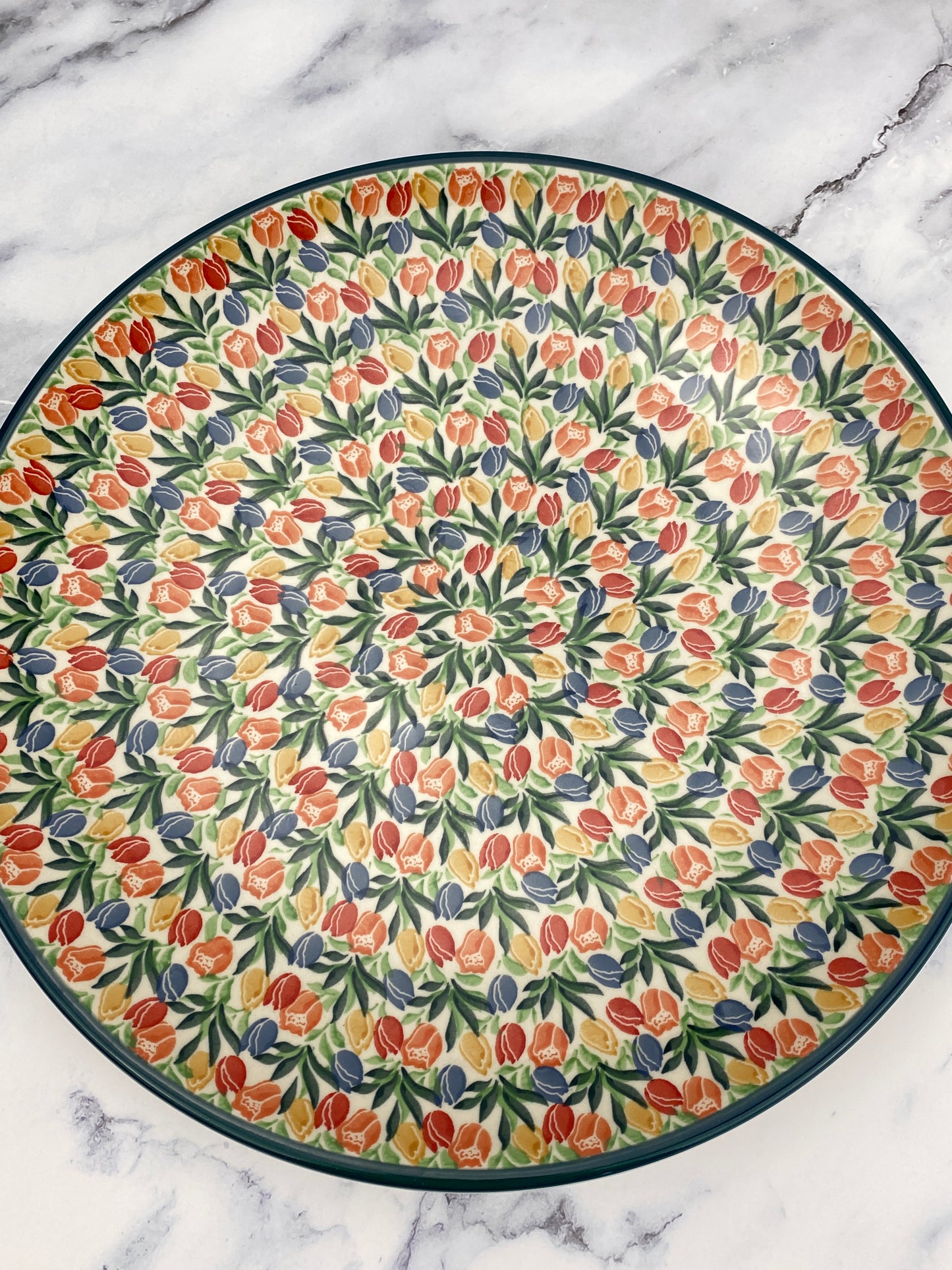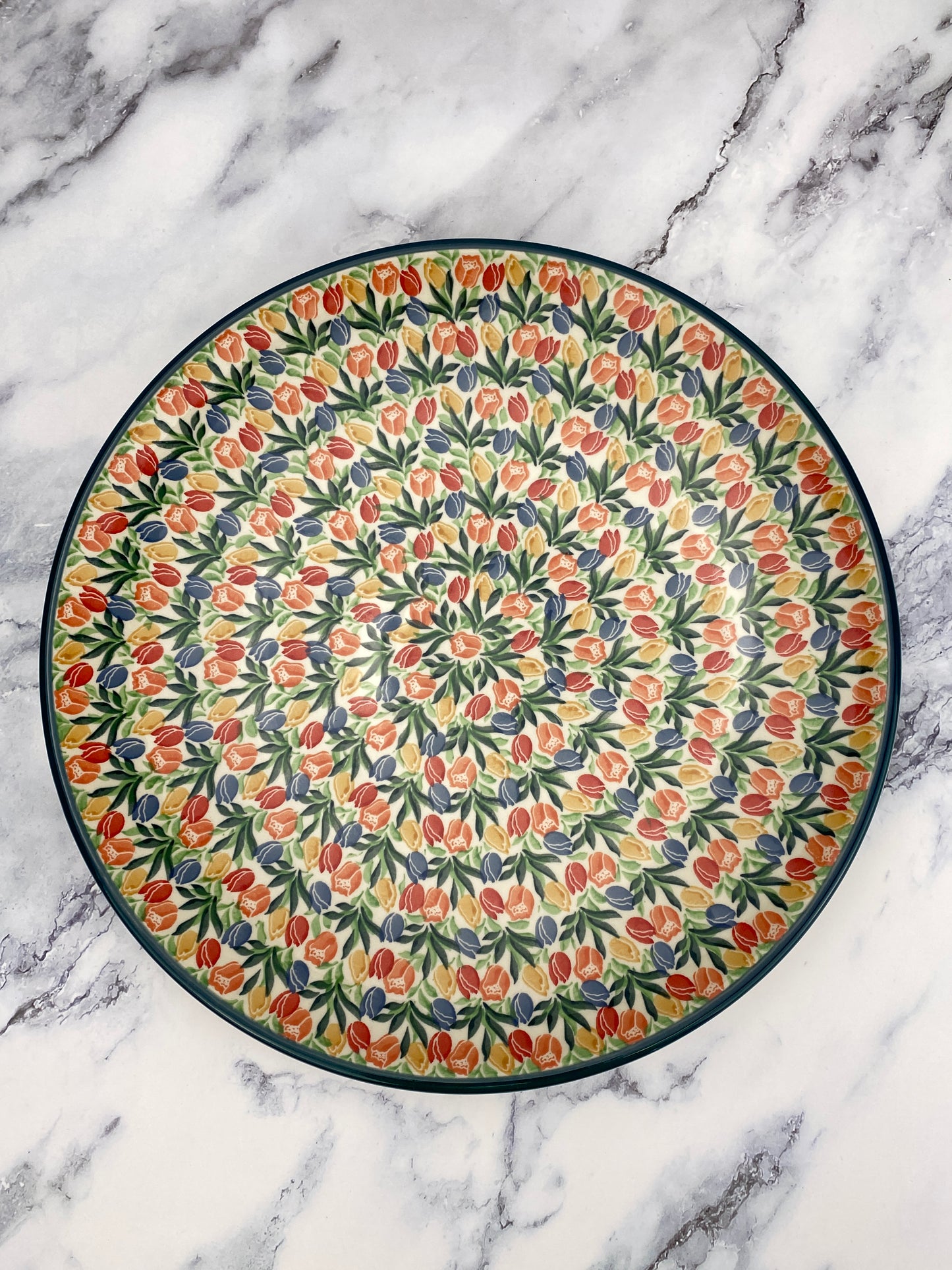 This gorgeous platter measures 14” in diameter and sits 1.7” off the ground. A true showstopping piece. The platter features two holes on the back for hanging.