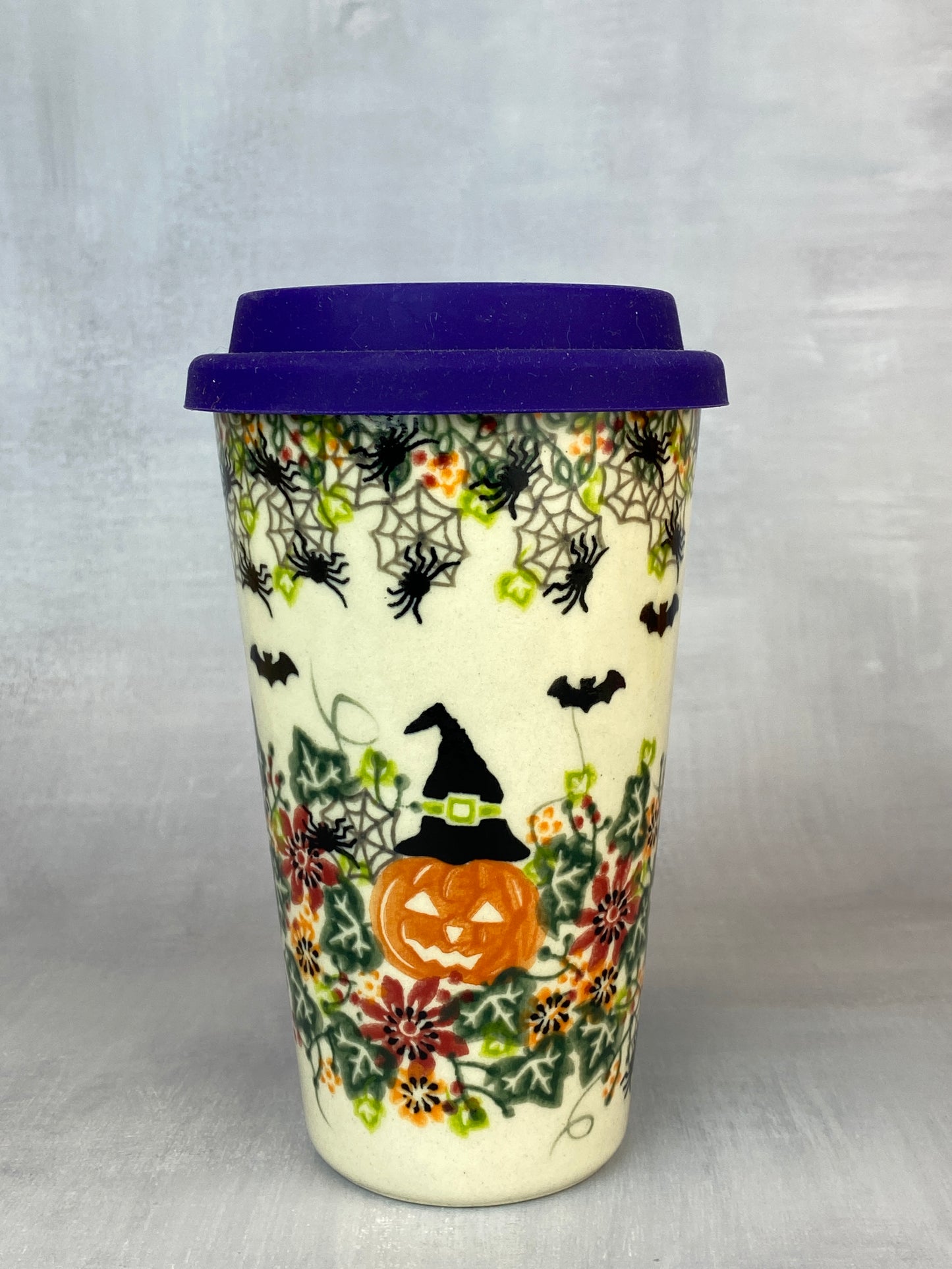 This travel mug holds 14oz and comes with a black rubber grip and top. 5.75 tall and 3.5" wide. Perfect for days on the go when you would like your Polish Pottery with you!