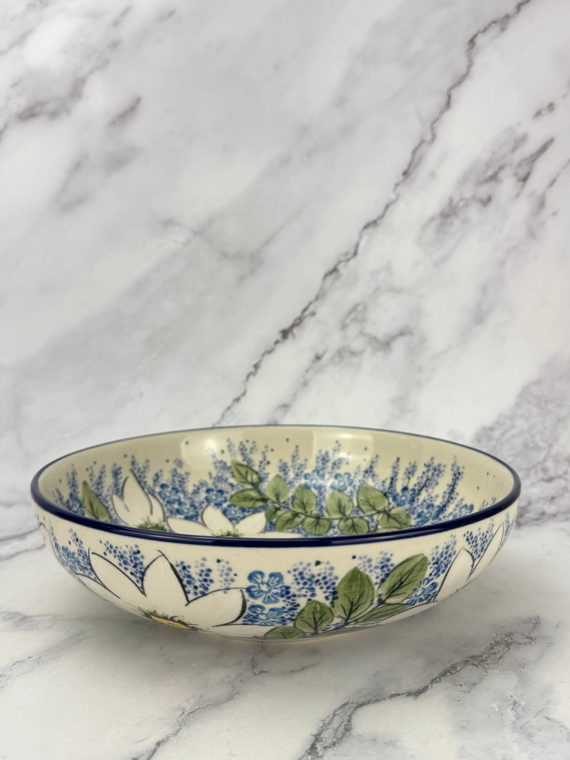 A gorgeous serving bowl with an 8.5" diameter that is 2.5" deep.