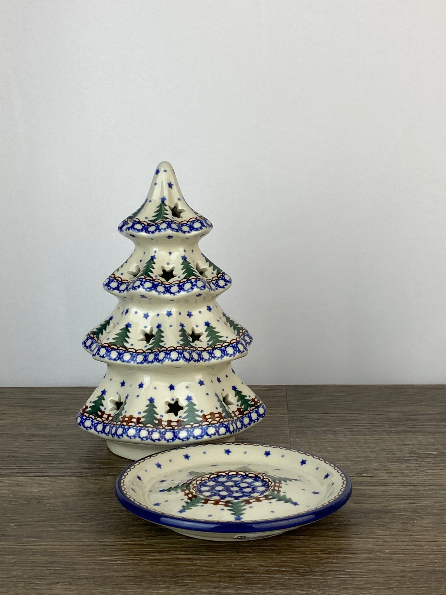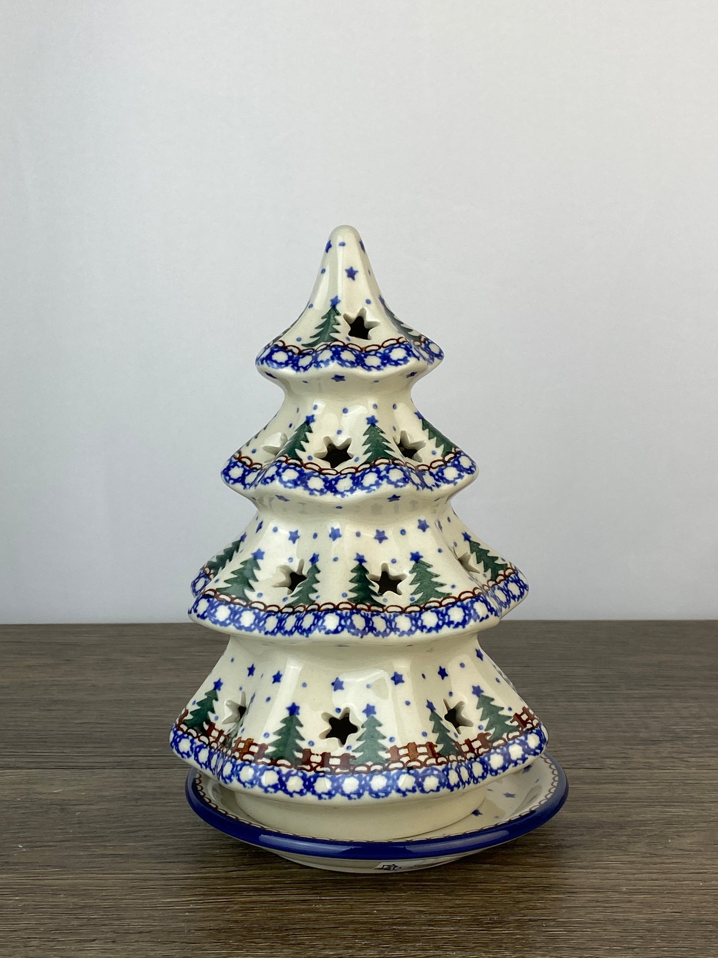 This lovely tree stands 8" tall and comes with a matching bottom plate. It features star shaped cut outs to let out a festive stream of light. Use with a tea light, or battery operated light. Set one out, or have a whole forest!