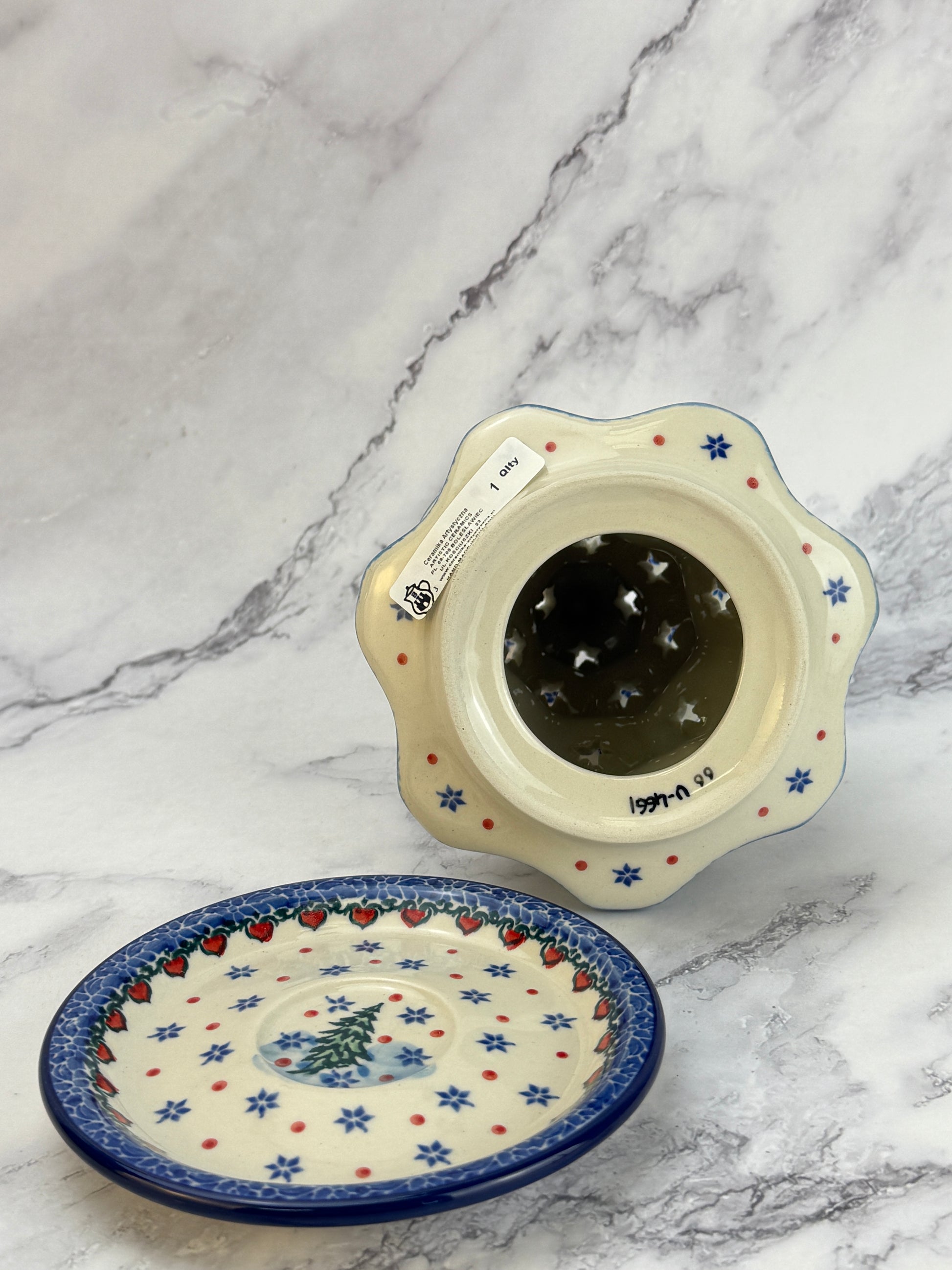 This lovely tree stands 8" tall and comes with a matching bottom plate. It features star shaped cut outs to let out a festive stream of light. Use with a tea light, or battery operated light. Set one out, or have a whole forest!