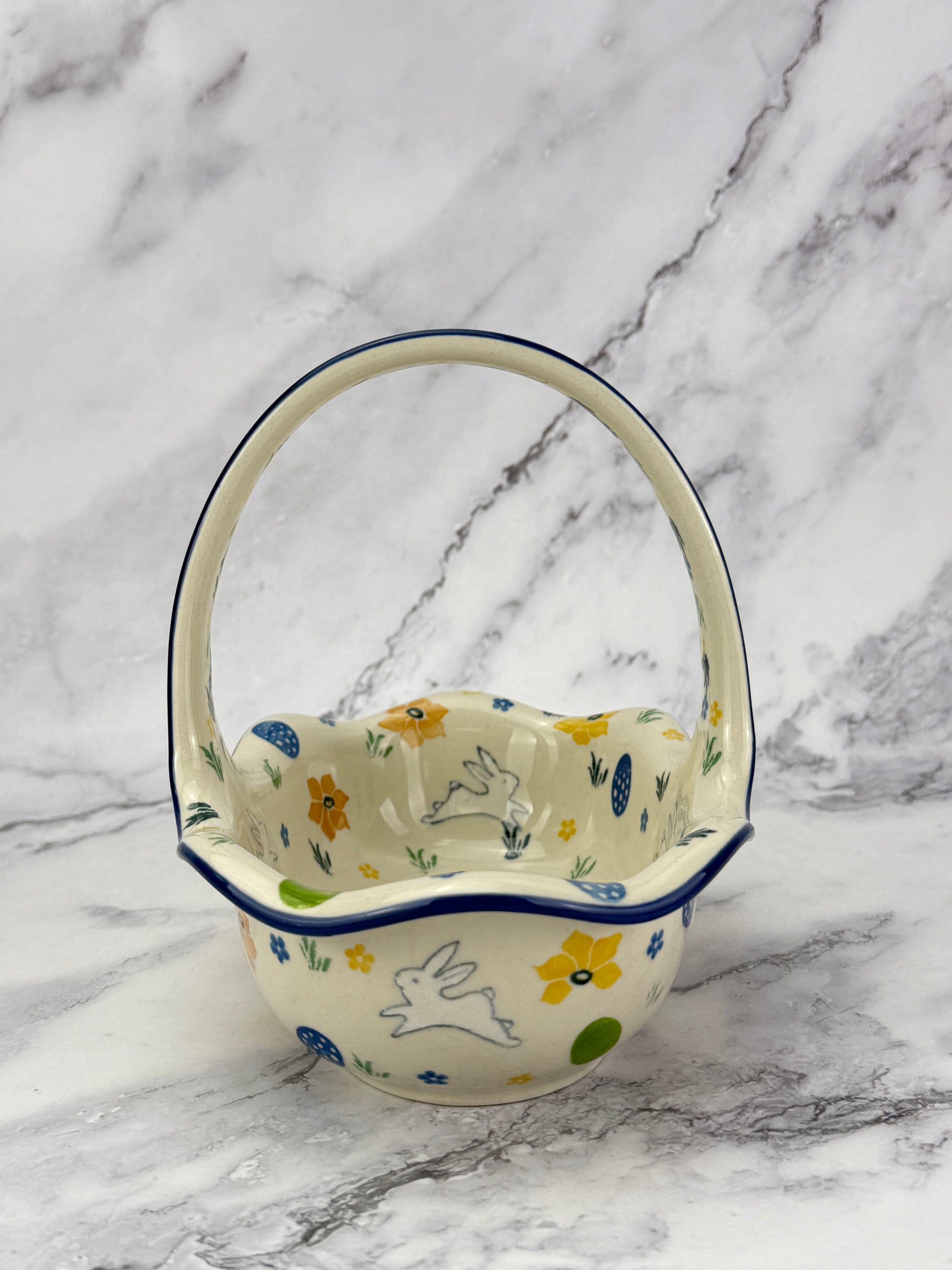 This gorgeous Easter basket measures 8.25x5.5x2x5, including the handle the basket is 7" tall. Fill it with Polish wooden eggs or ceramic eggs, or use it to serve a side dish!