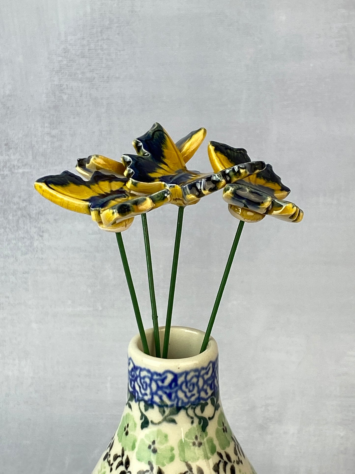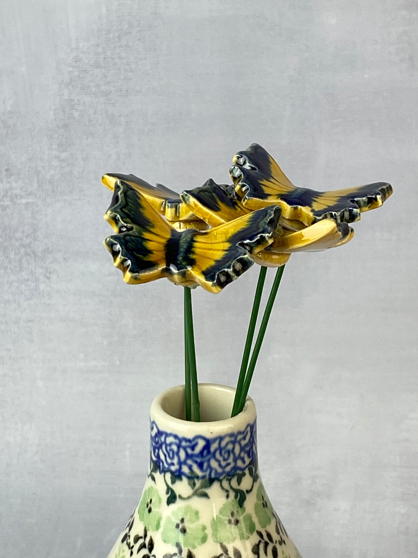 These butterflies measure about 1.5"x1" with a flexible 8" stem and are adorable in potted plants, or in a bouquet with other ceramic flowers. Sold individually.