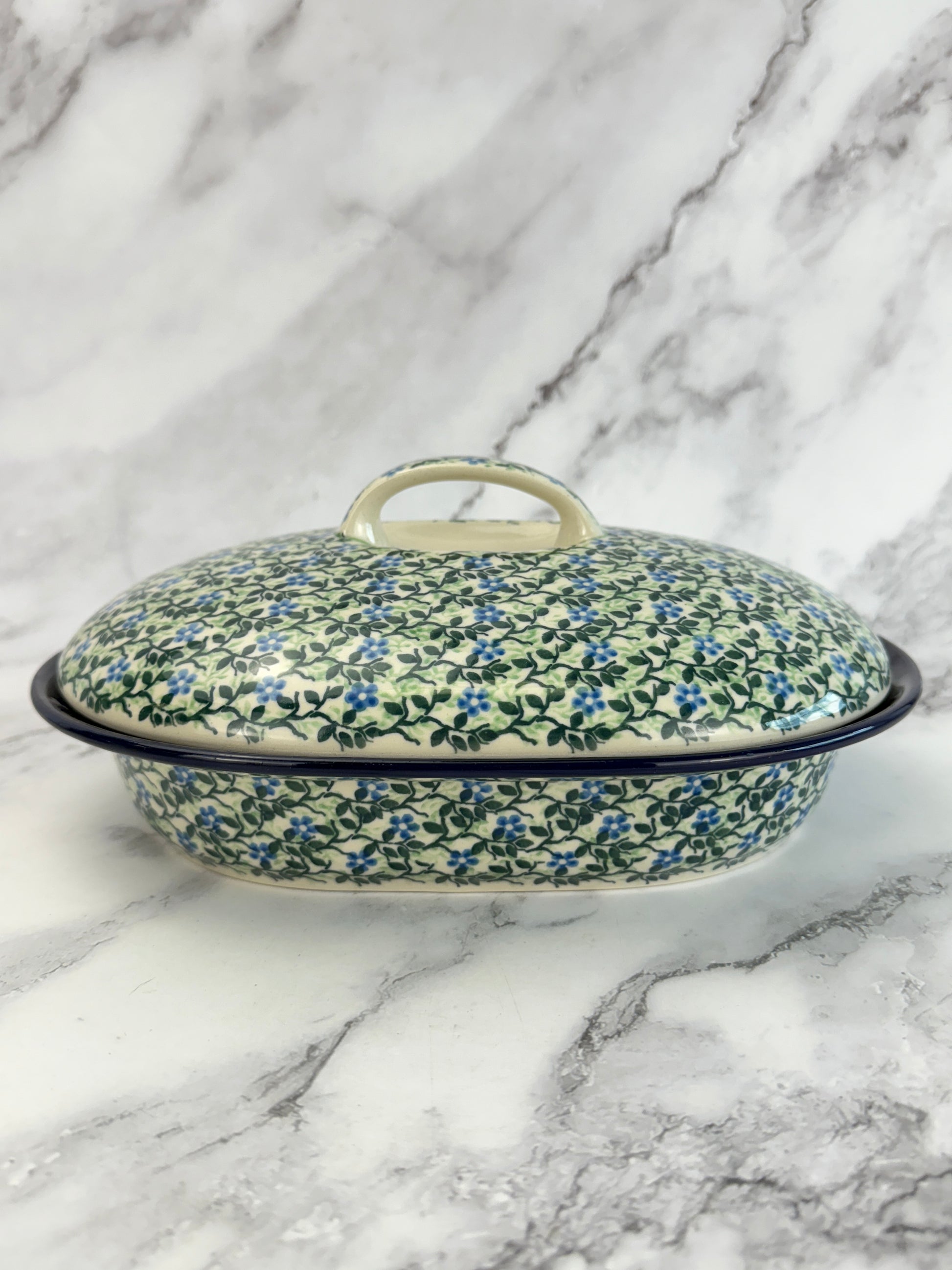 A lovely covered baker that measures 10x7.75x2". The dish is 4" tall including the height of the lid. Inner dimensions are 8.5x6x2". Perfect for use with or without the lid.