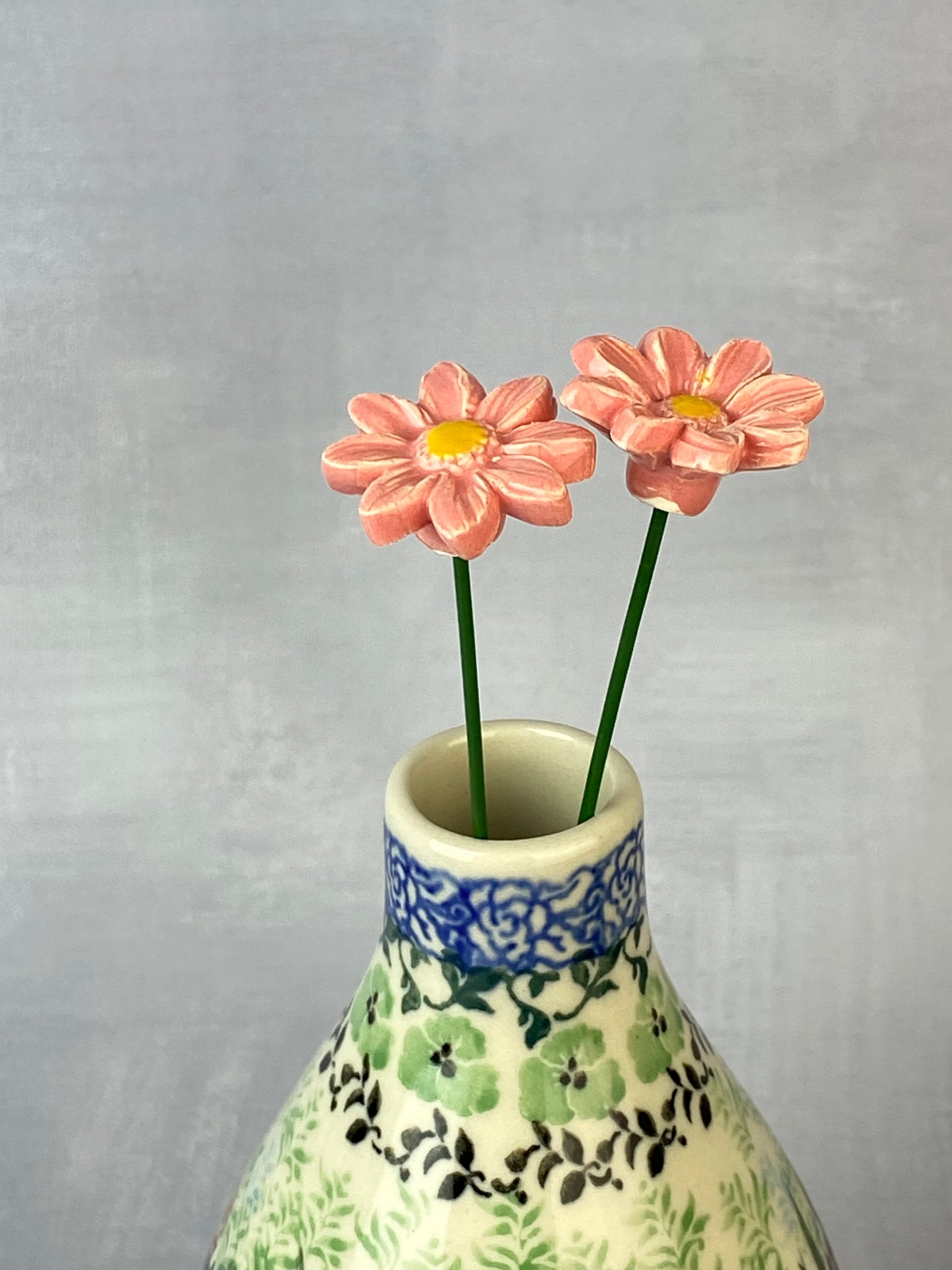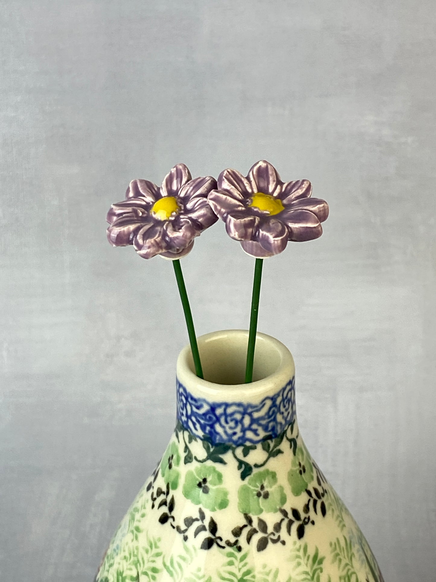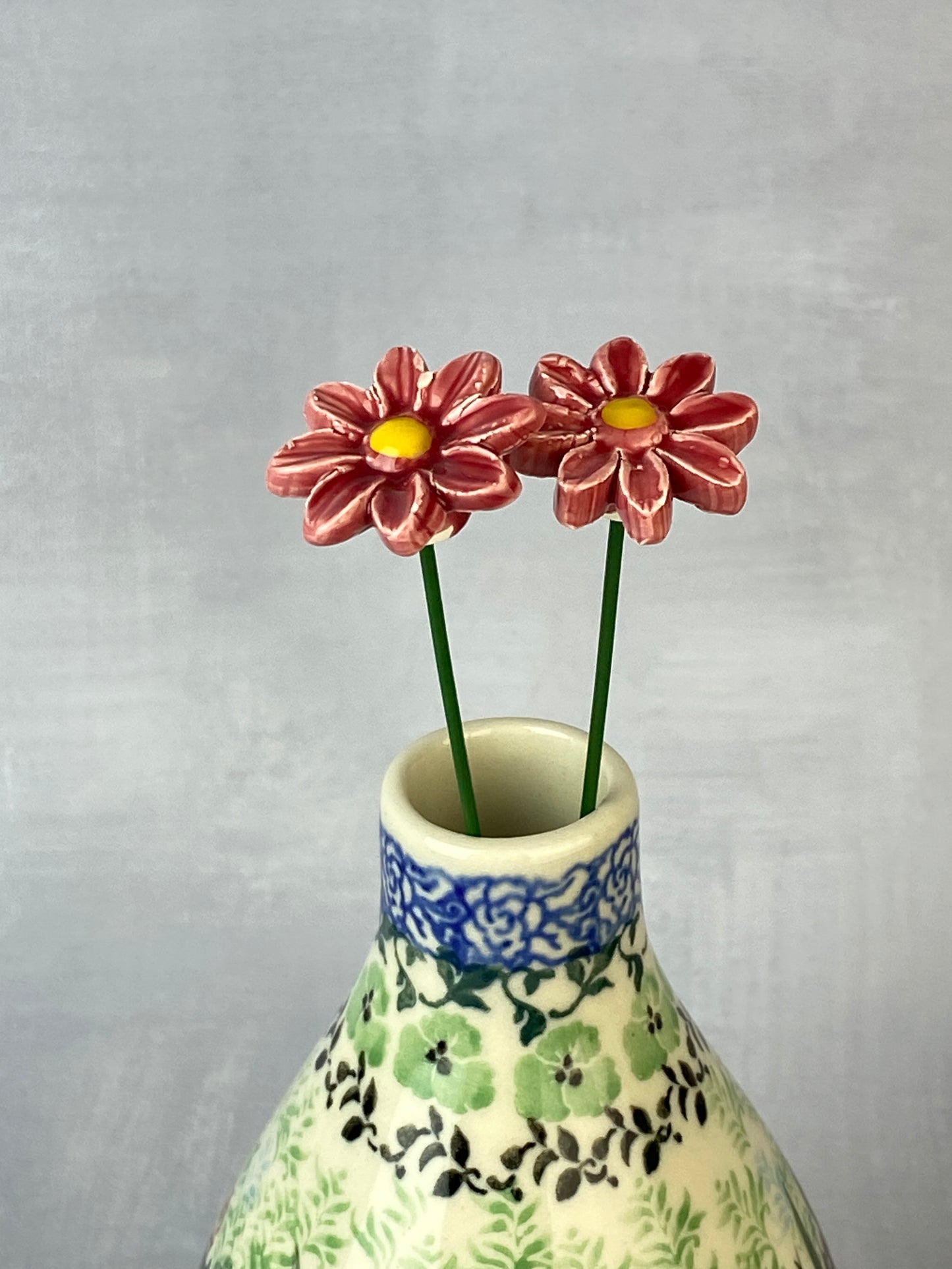 These adorable flowers have a 1" diameter with a flexible 8" stem and are adorable in potted plants, or in a bouquet with other ceramic flowers. Sold individually.