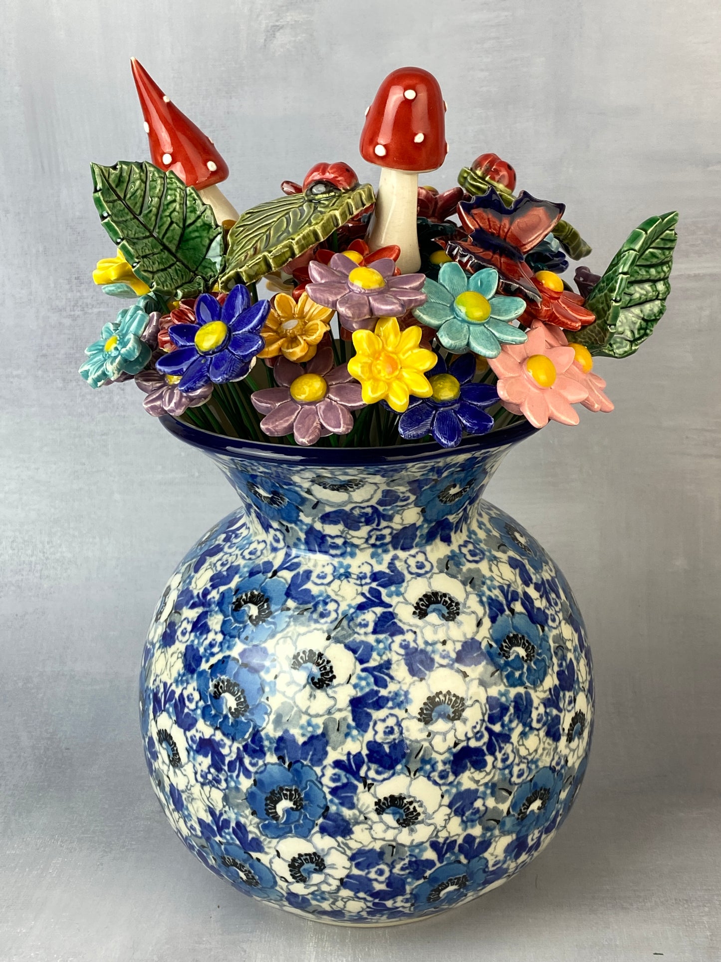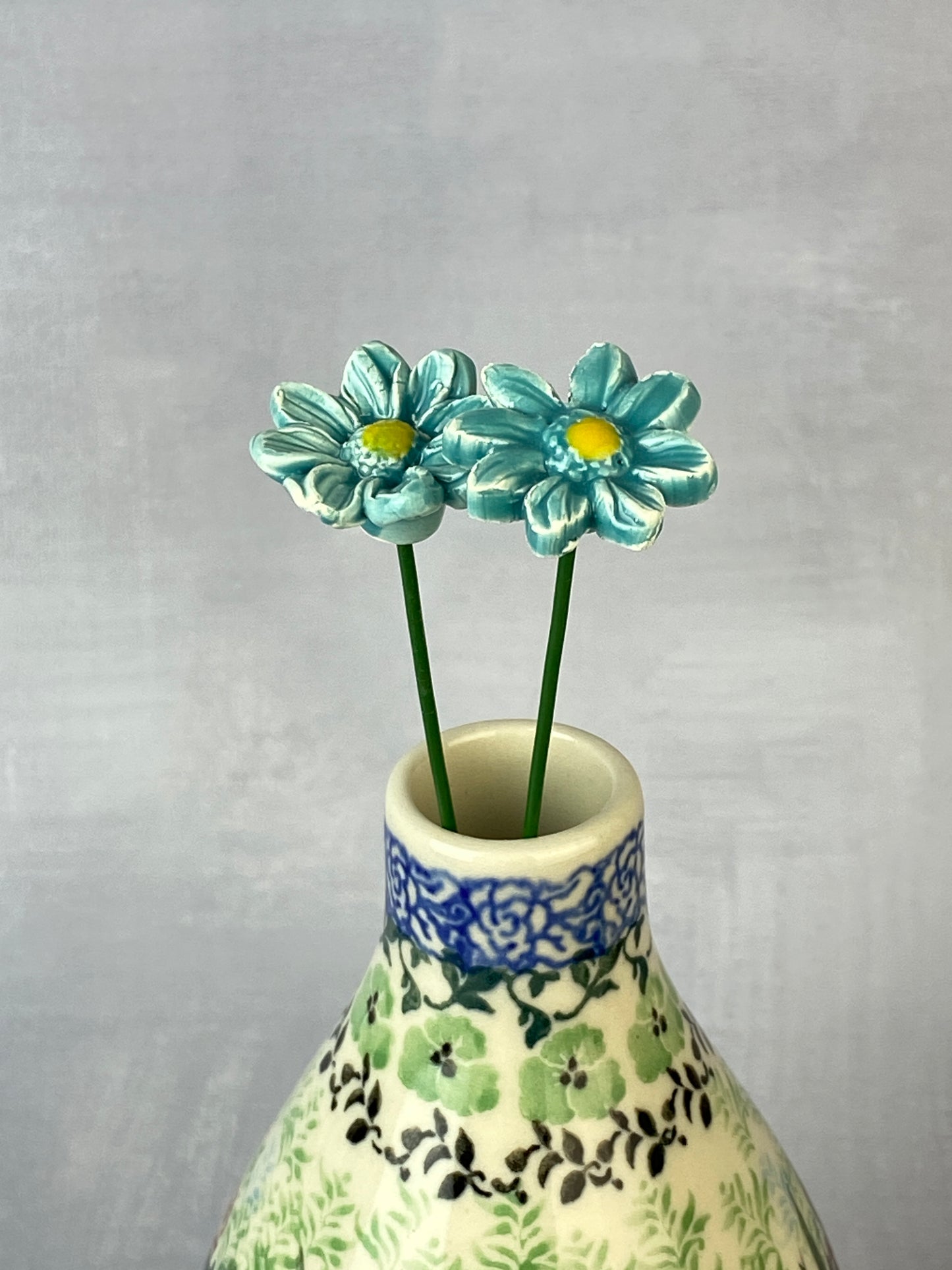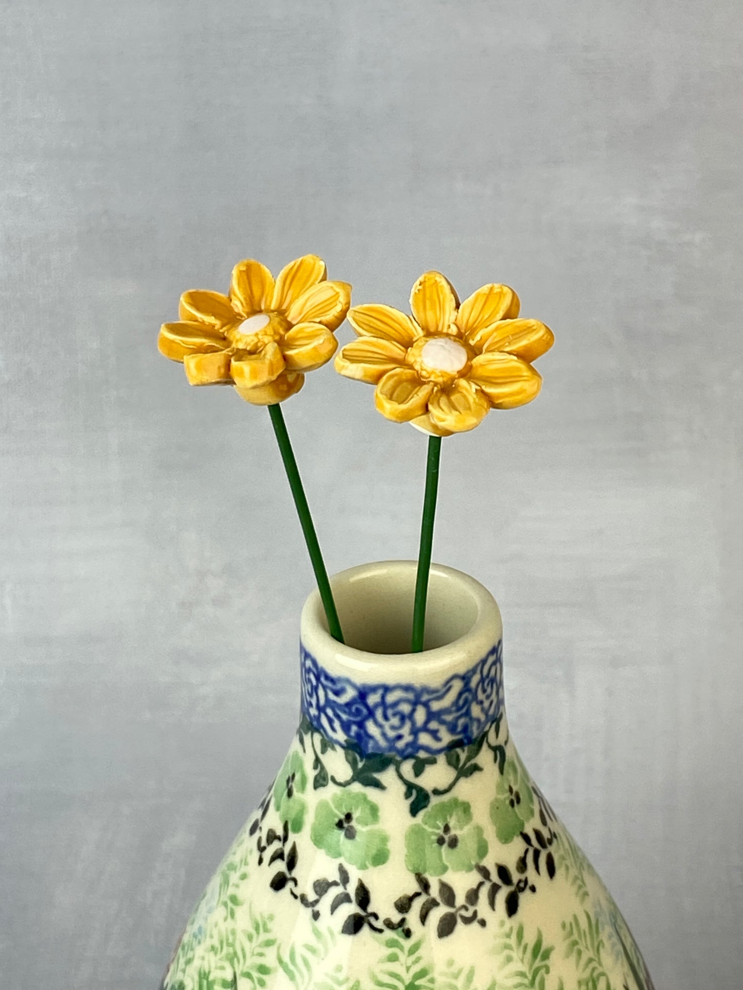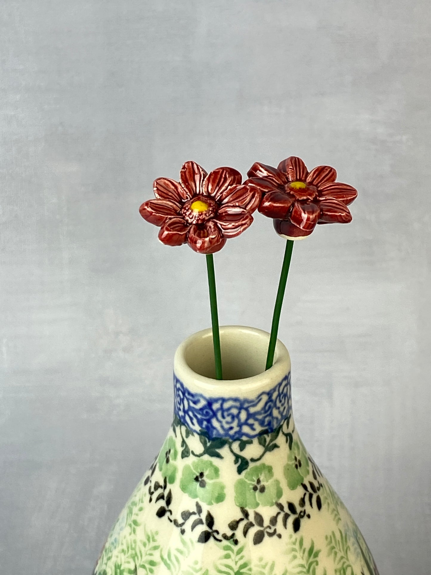 These adorable flowers have a 1" diameter with a flexible 8" stem and are adorable in potted plants, or in a bouquet with other ceramic flowers. Sold individually.