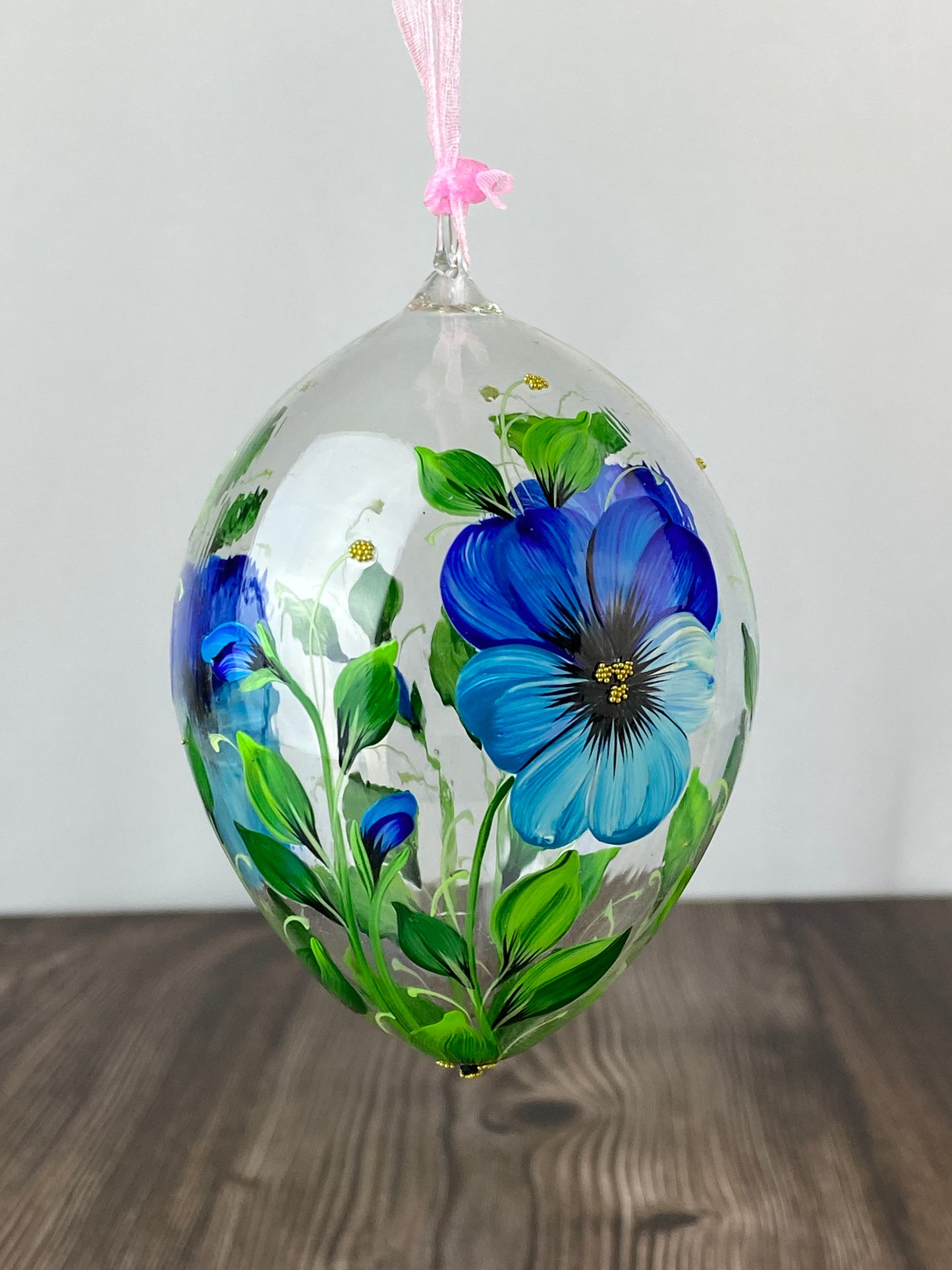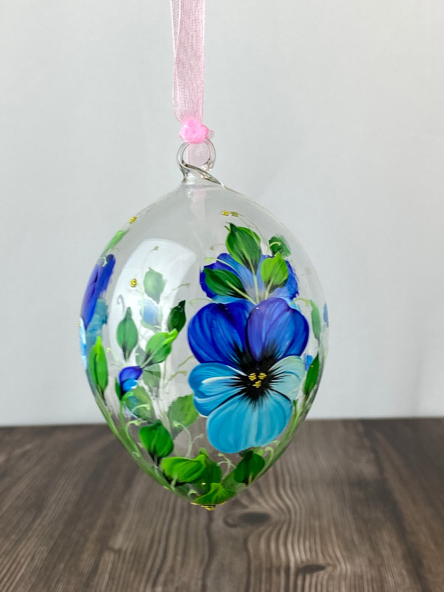 These incredible glass ornaments measure about 3.5x2.5". A beautiful decoration for an Easter tree, as well as to keep out year round. Their bright flowers and beautiful details make them a joy to look at every day.