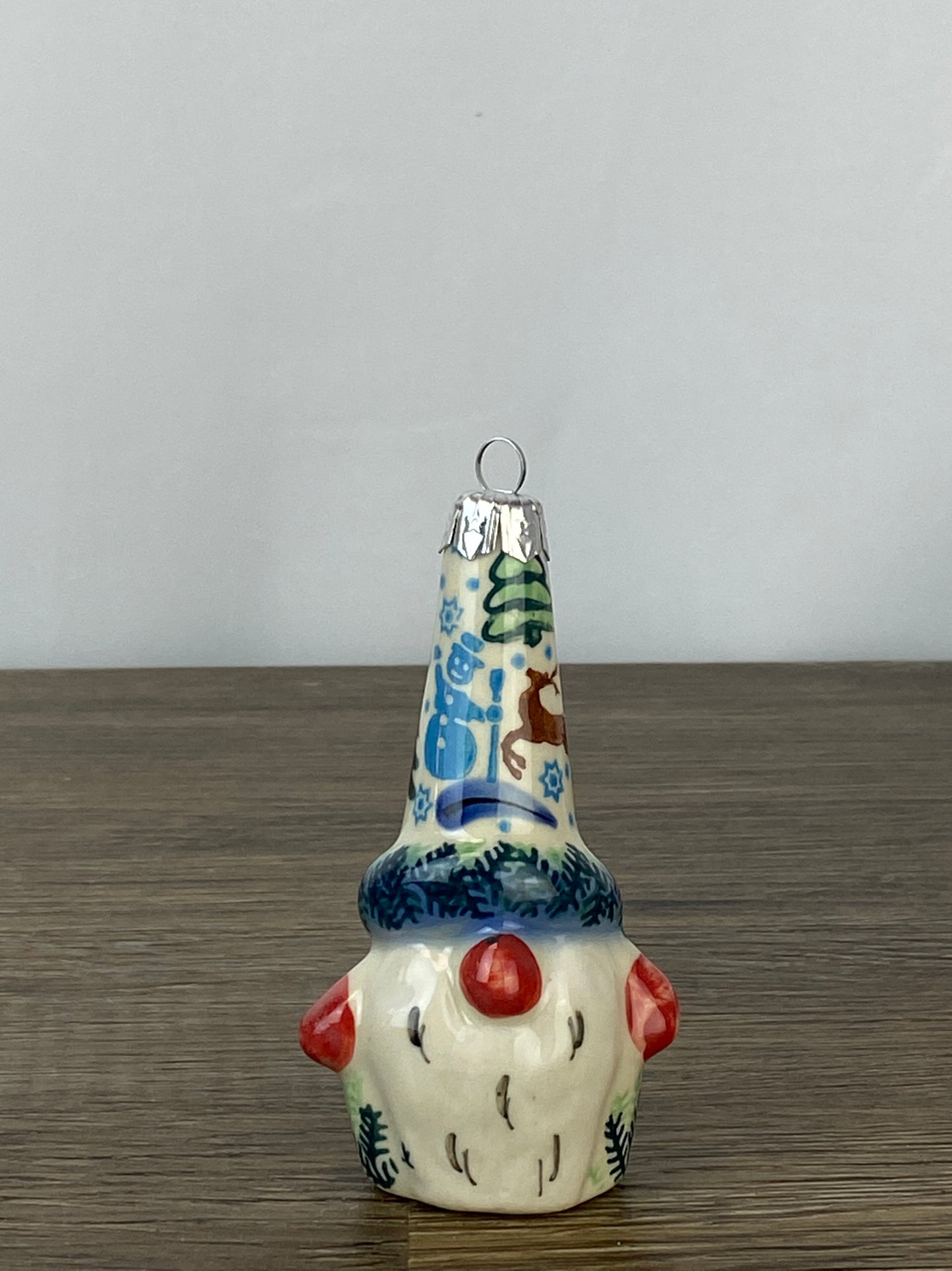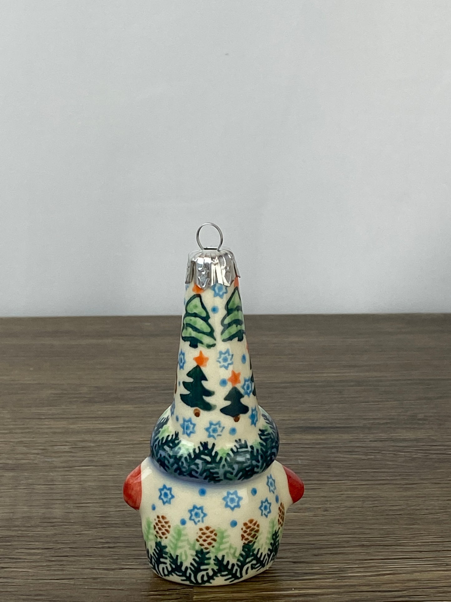A darling gnome shaped ornament. The gnome stands 4.25" tall and is 2.25" wide.