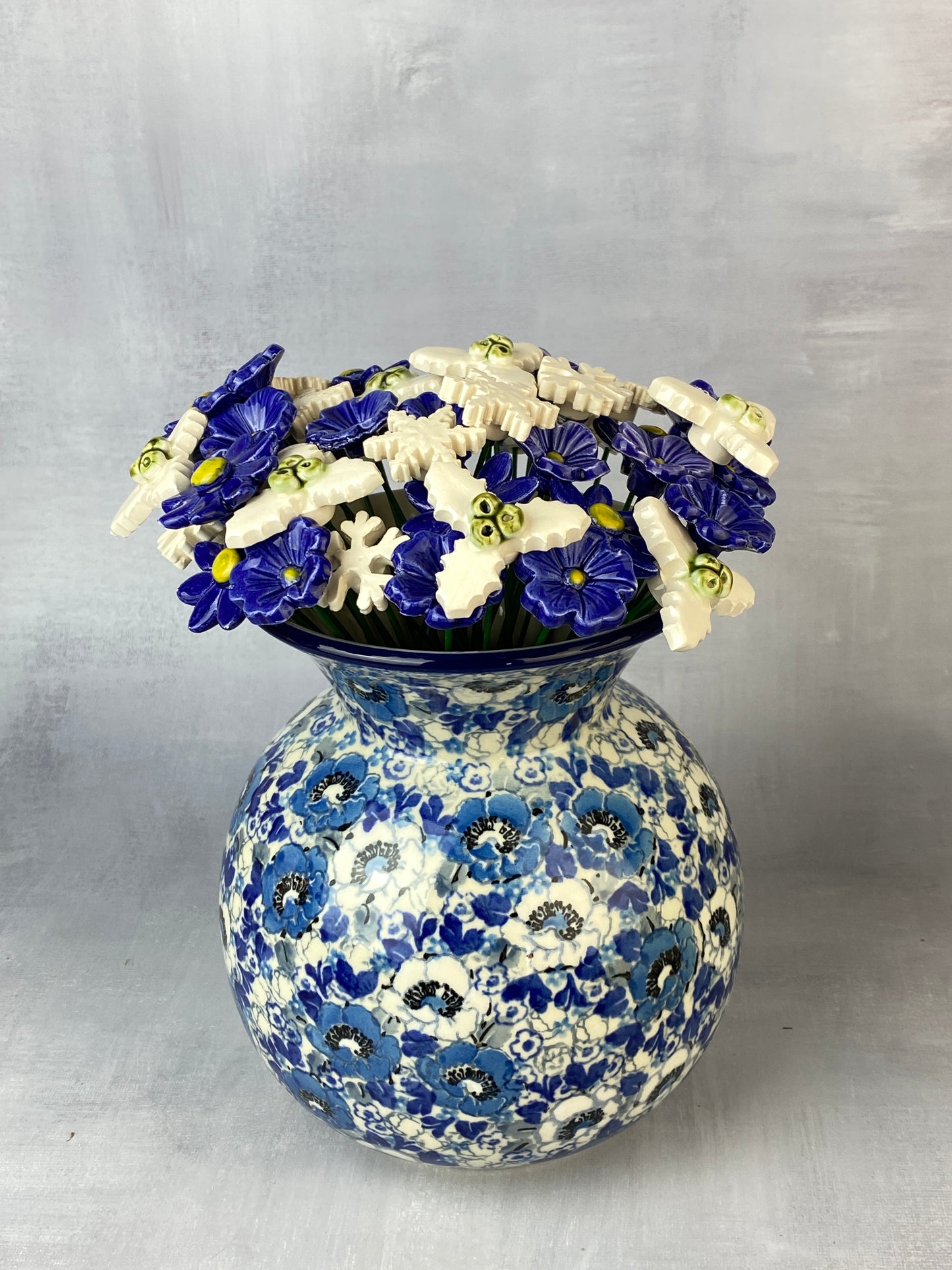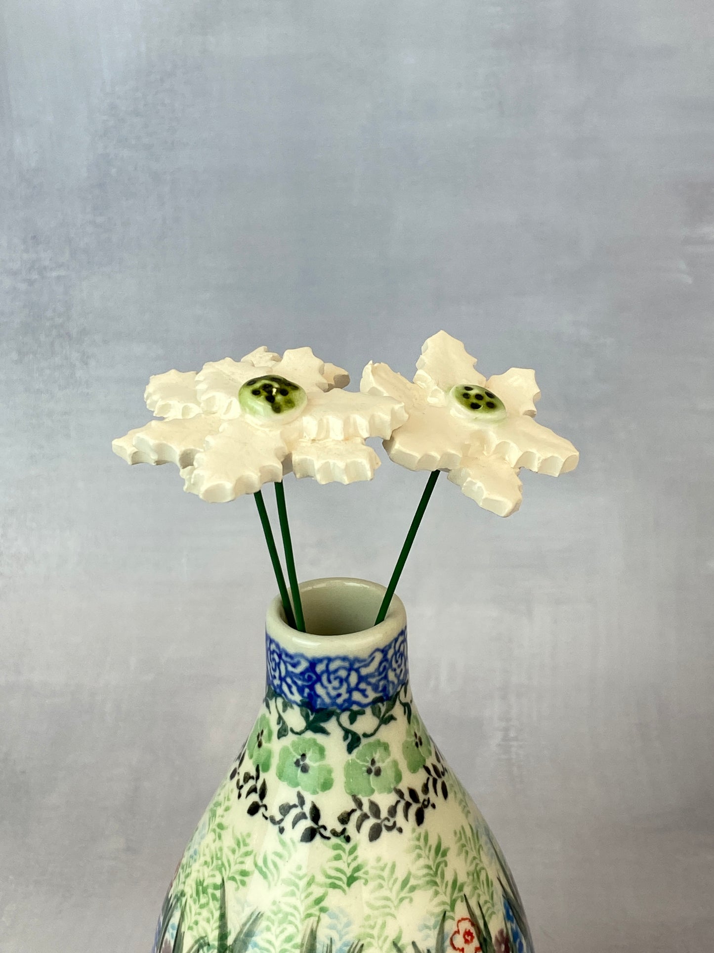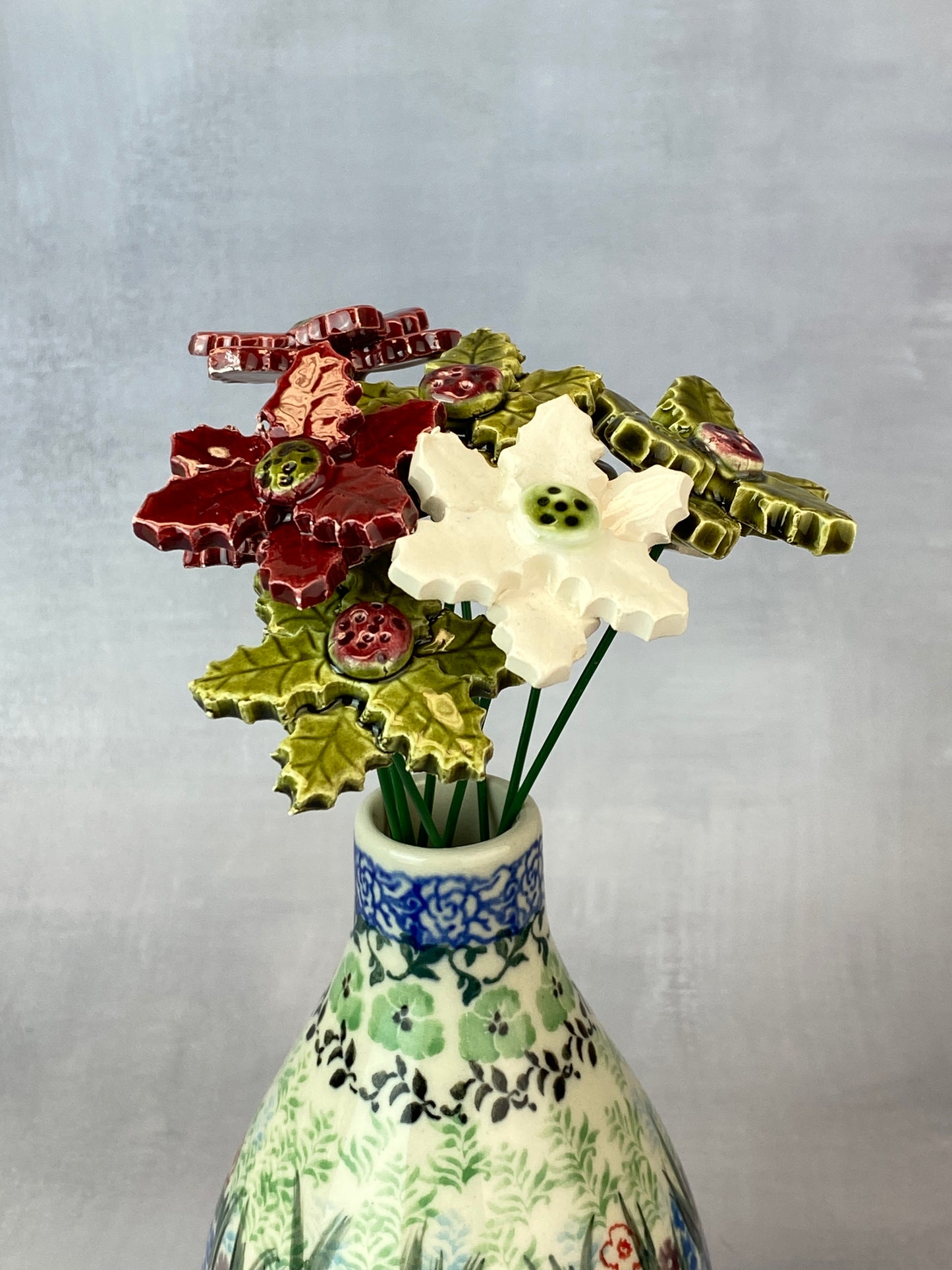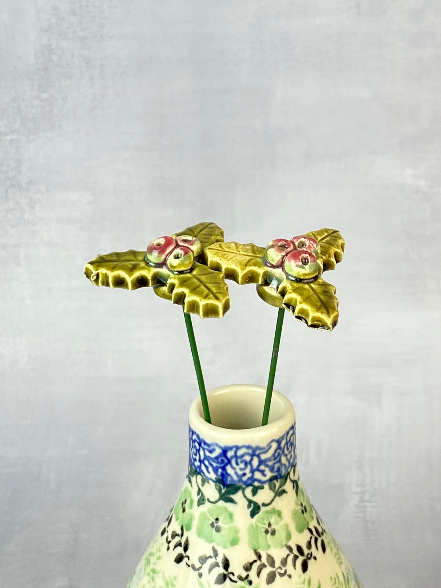 The five leaf versions of the holly have a 1.75" diameter, the three leaf versions have a 1.5" diameter. Both with a flexible 8" stem and are adorable in potted plants, or in a bouquet with other ceramic flowers. Sold individually.