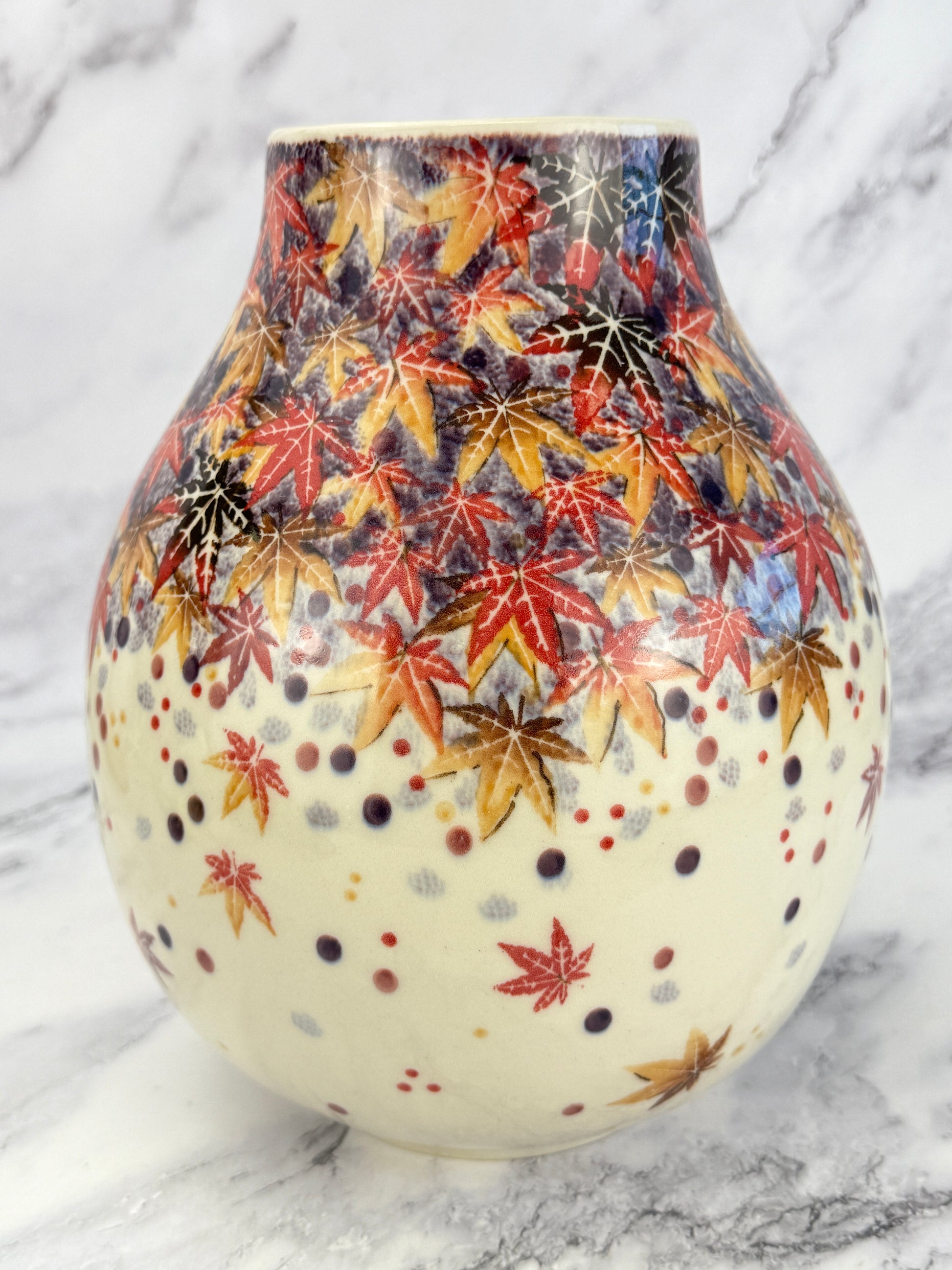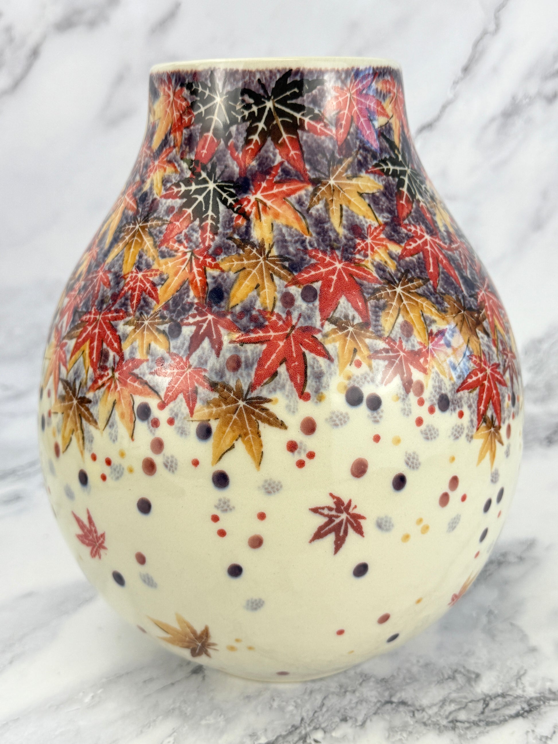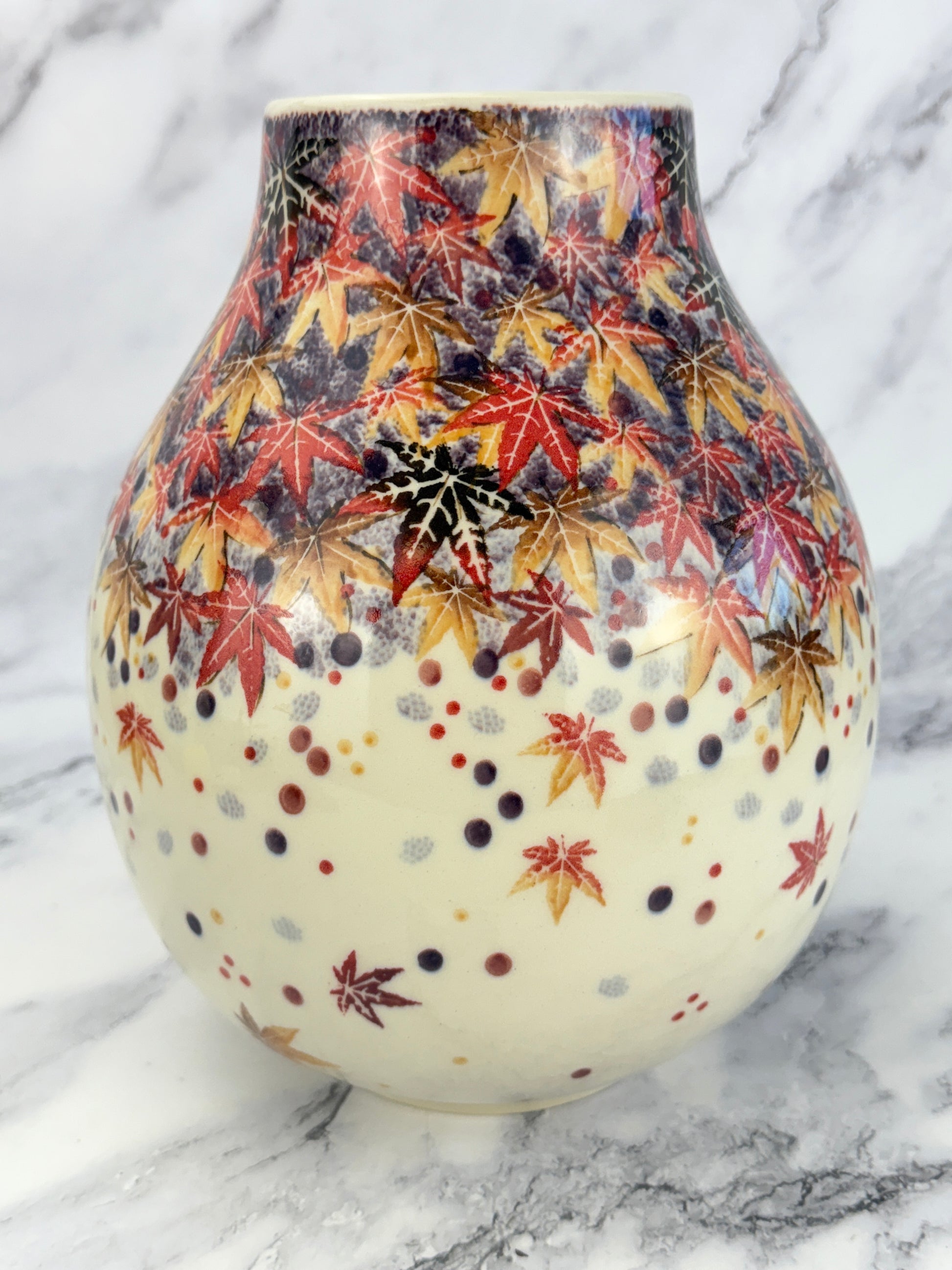An absolutely adorable squat vase in the most gorgeous pattern! This vase stands 9.75" tall, and has a 3.5" opening. It is 7" wide at the widest point.