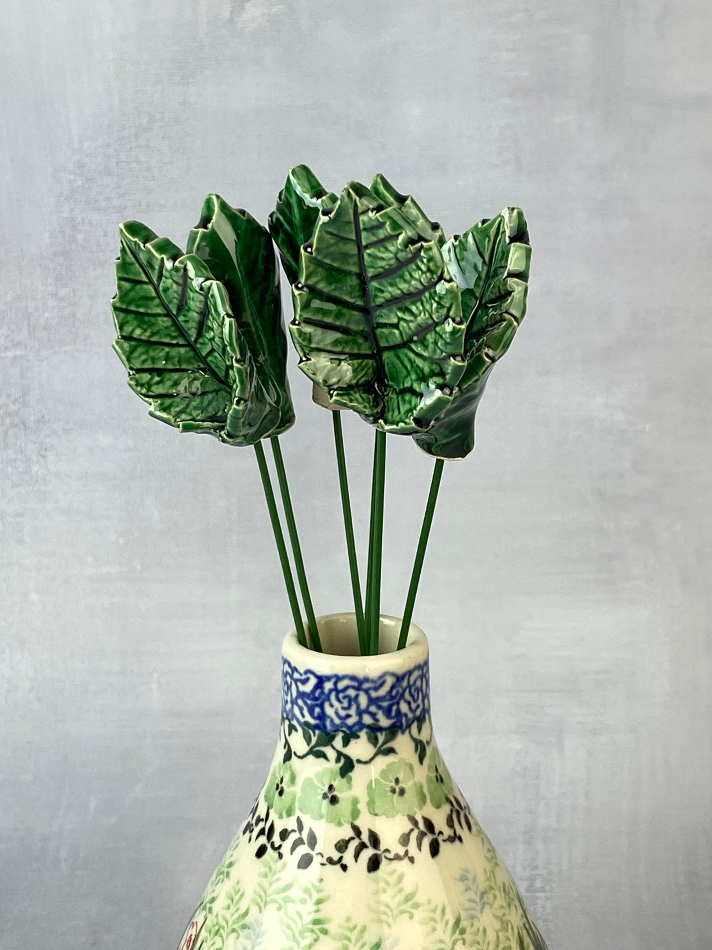 These leaves measure about 2" long, and 1" wide with a flexible 8" stem and are adorable in potted plants, or in a bouquet with other ceramic flowers. Sold individually.