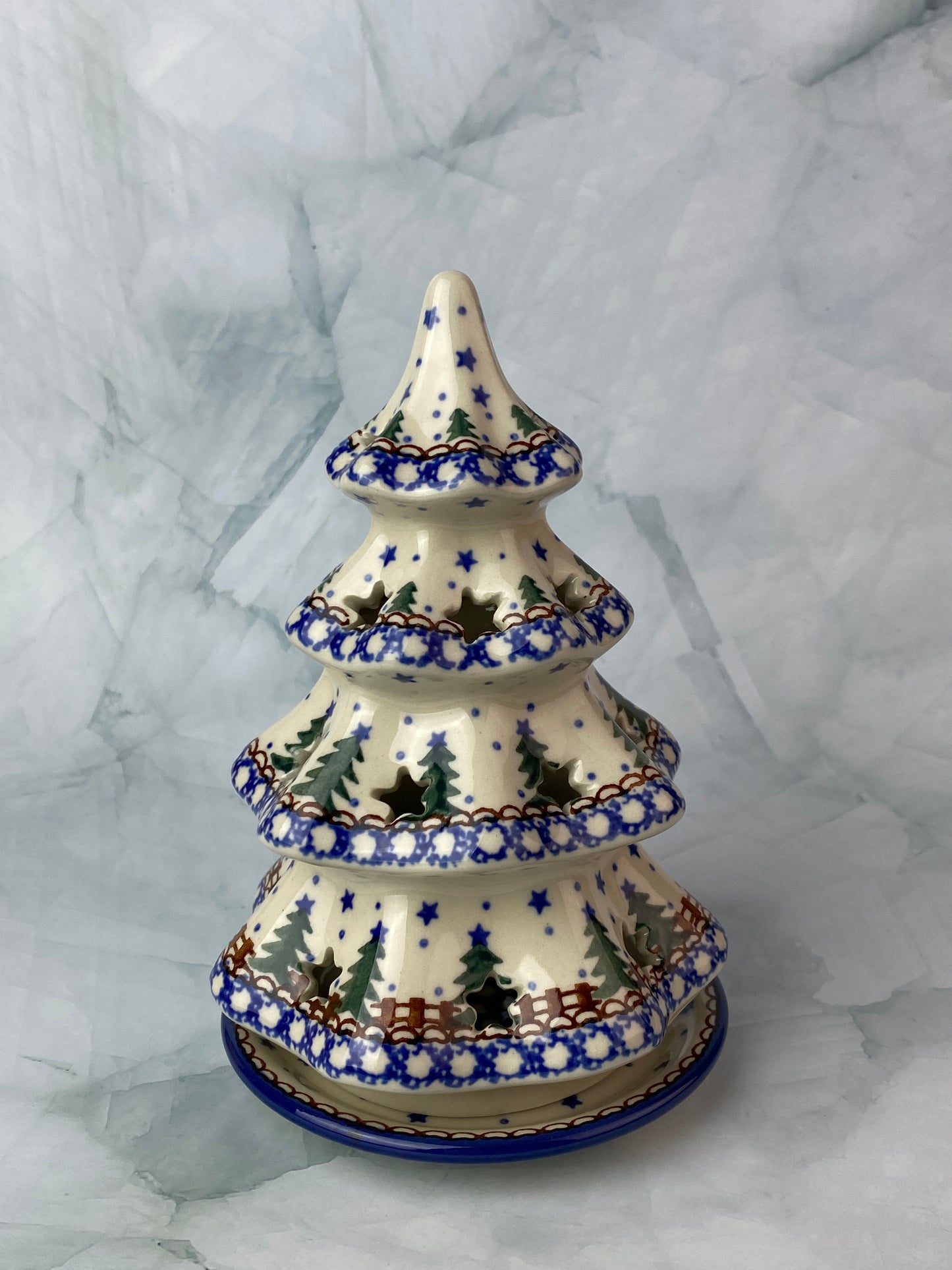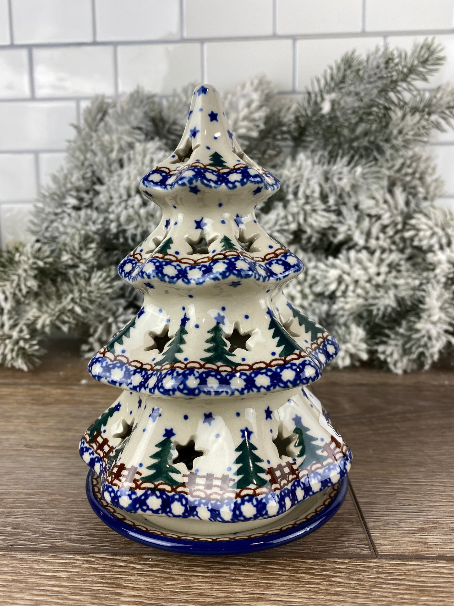 This lovely tree stands 7" tall and comes with a matching bottom plate. It features star shaped cut outs to let out a festive stream of light. Use with a tea light, or battery operated light. Set one out, or have a whole forest!