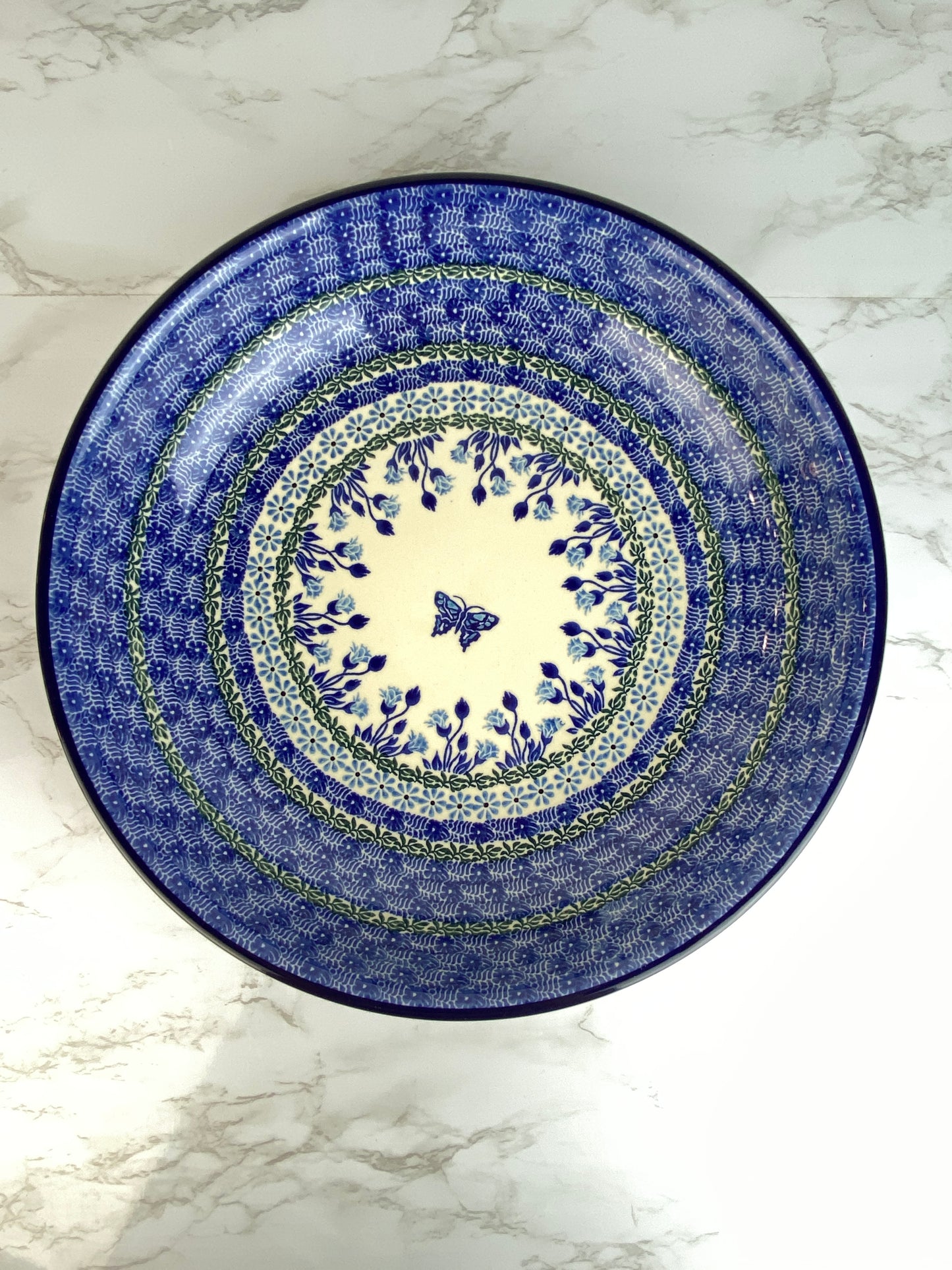 This gorgeous pasta server / bowl has a 12.75" diameter and is 2.5" deep.