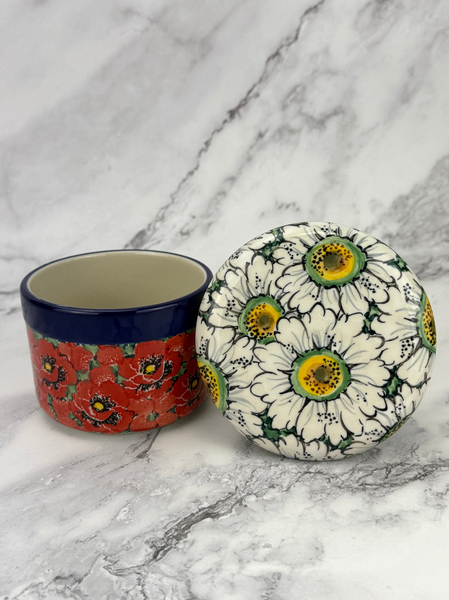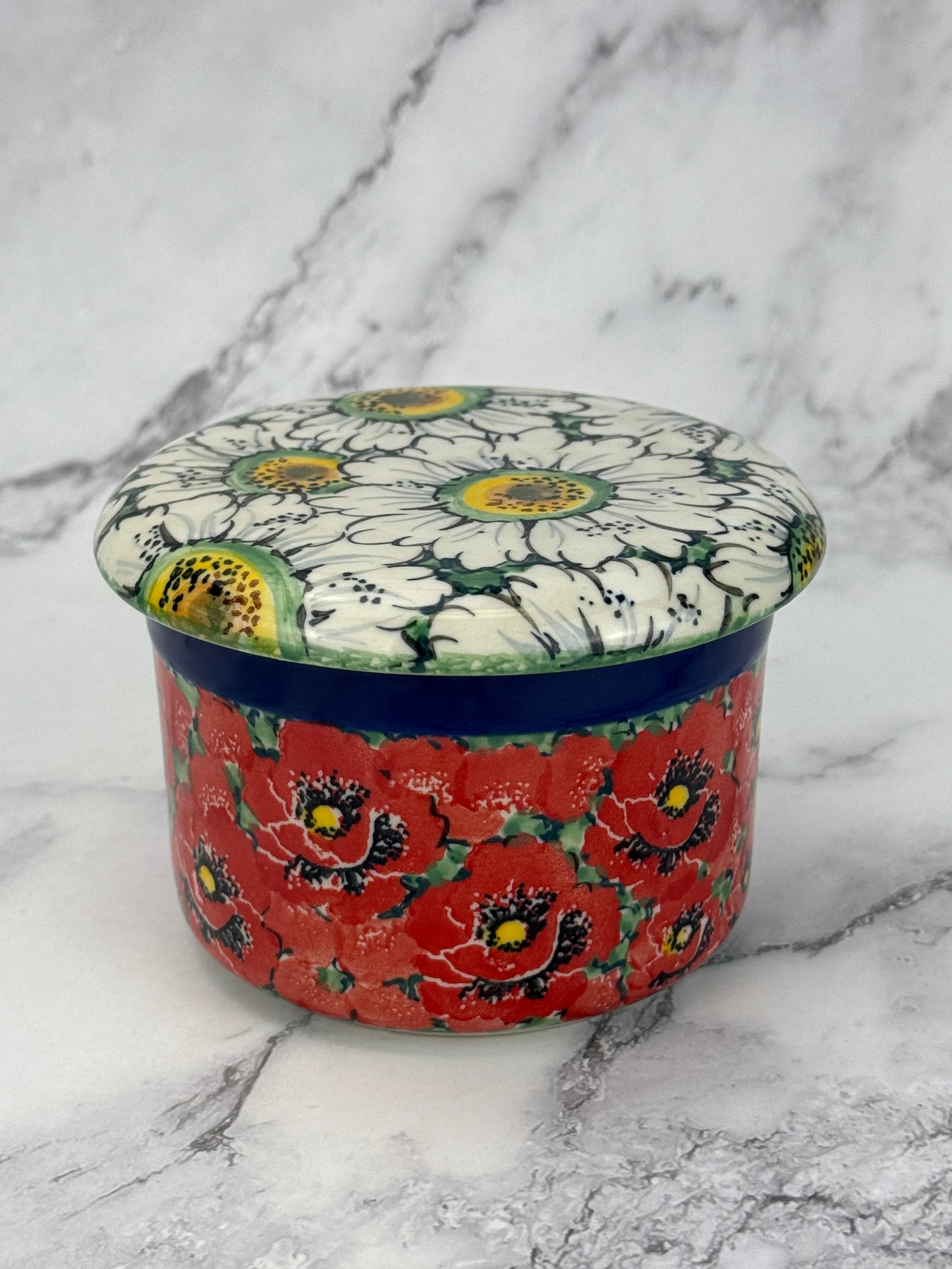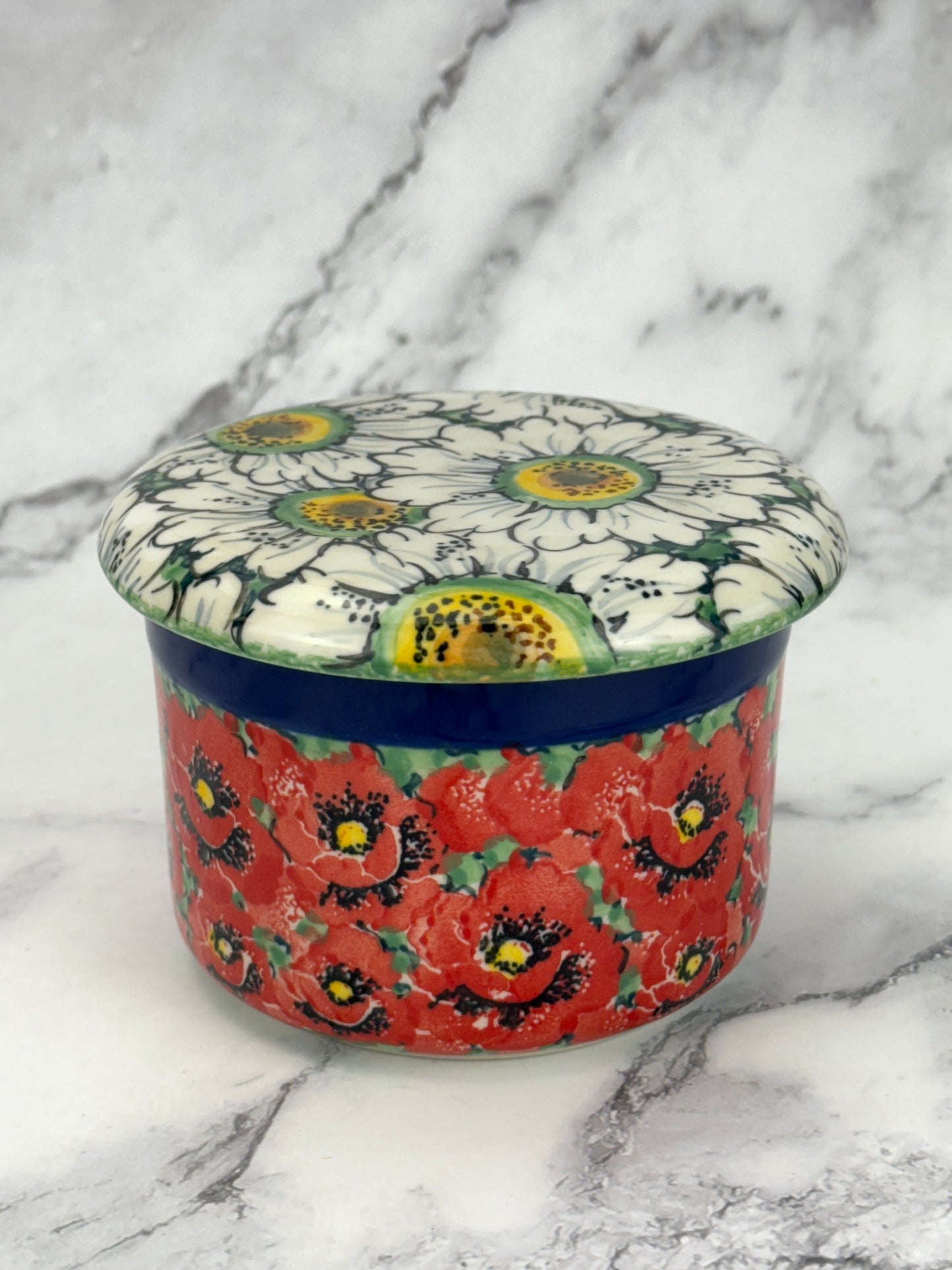 This Unikat Butter crock is a high-quality, French-style butter crock crafted from Polish stoneware. Its durable design and intricate, hand-painted pattern make it a stylish and long-lasting addition to any kitchen table. Perfect for storing and serving butter and other soft spreads.