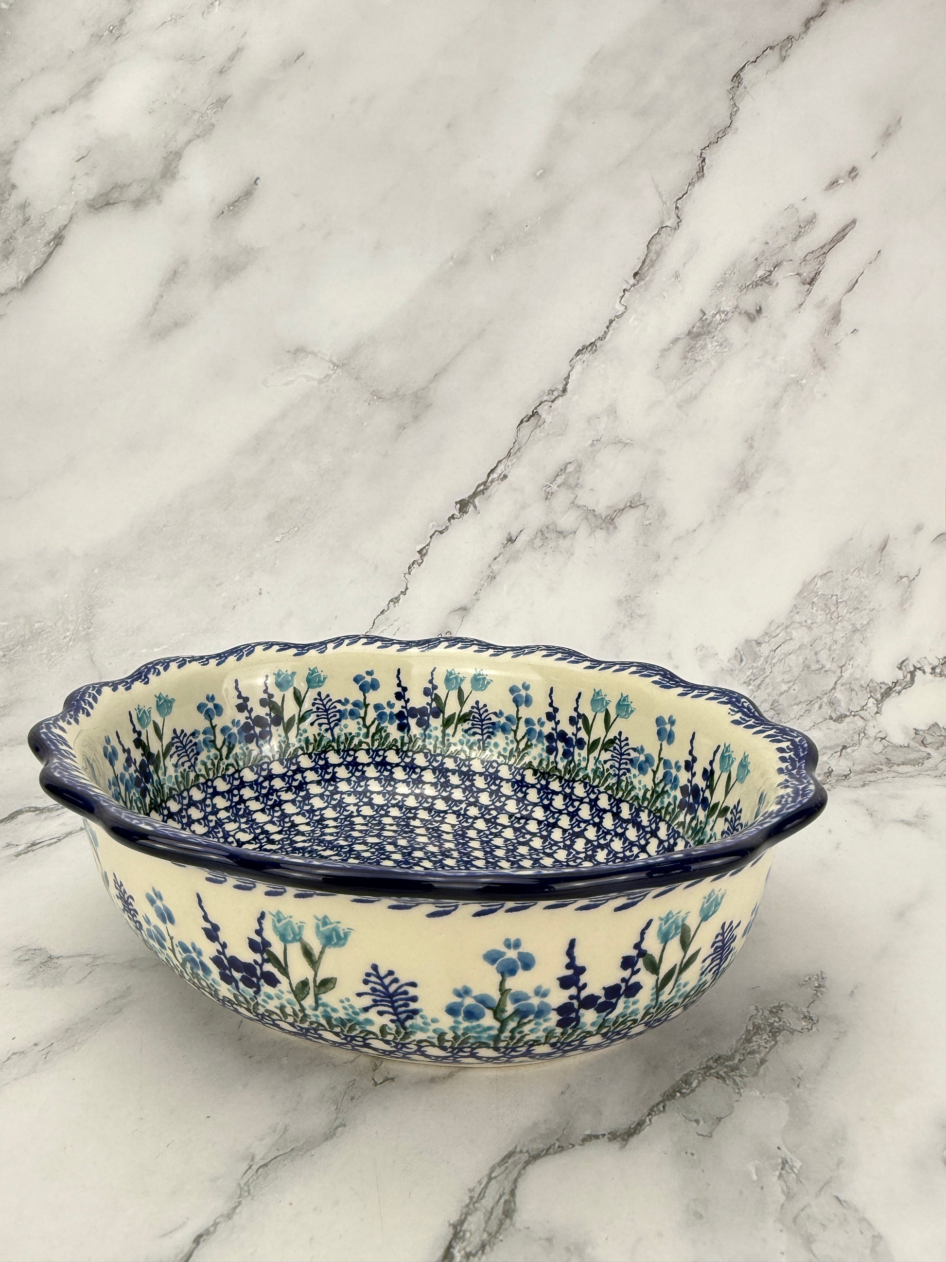 This gorgeous bowl measures 9x8x2.8". A beautiful and unique shape that makes it useful for both serving and baking. A little casserole would look darling in here!