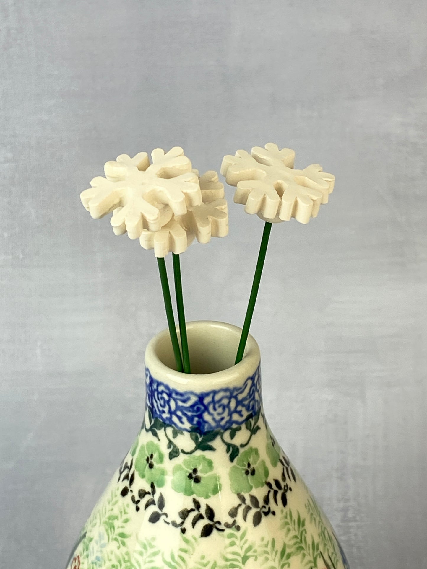 These adorable snowflakes have a 1" diameter with a flexible 8" stem and are adorable in potted plants, or in a bouquet with other ceramic flowers. Sold individually.