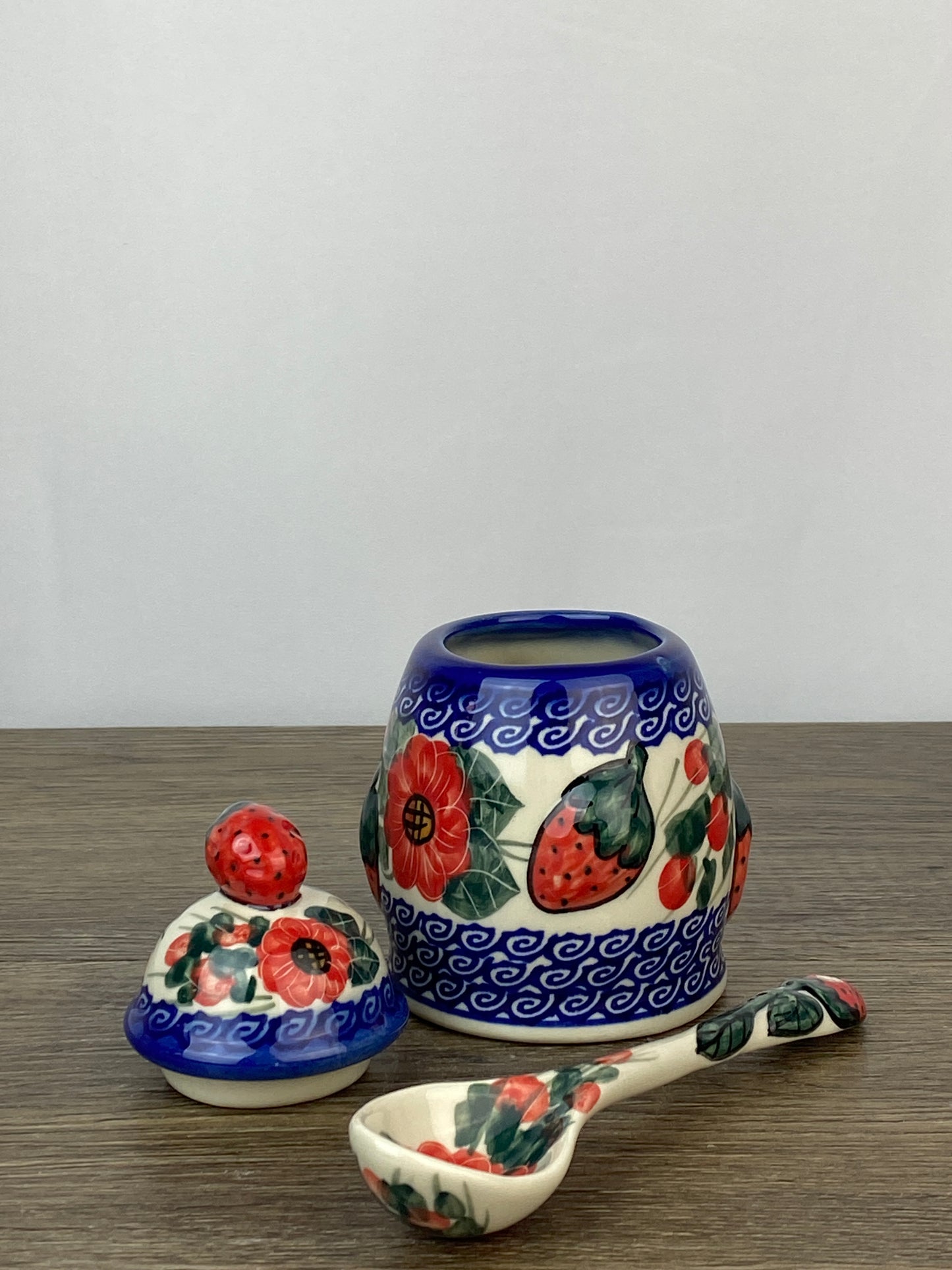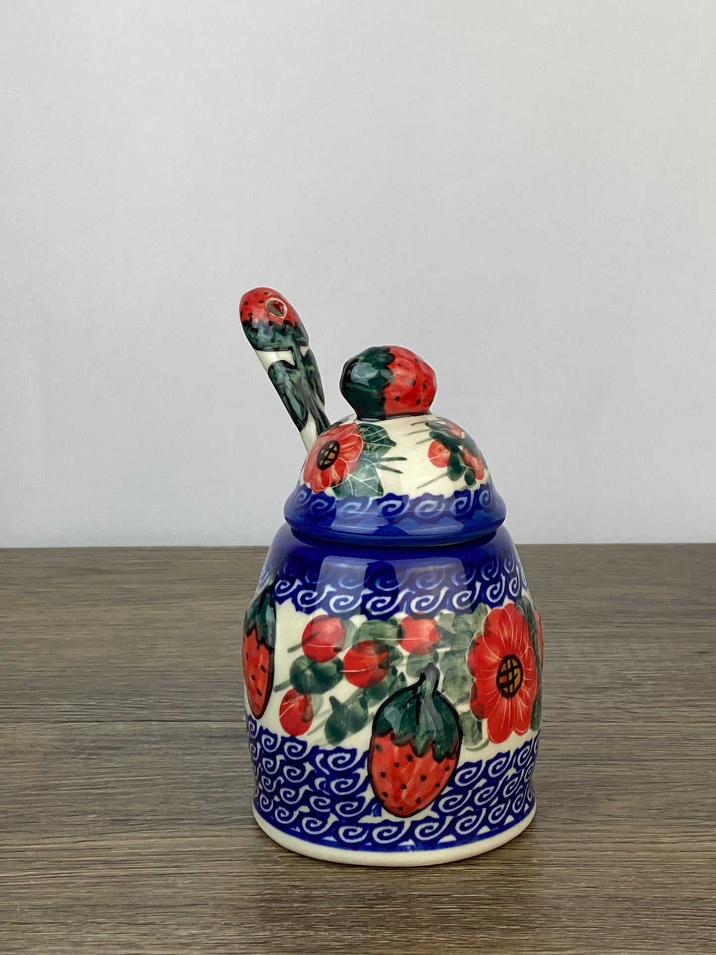A charming honey jar and matching ceramic spoon. 5" tall, 3.5" wide.