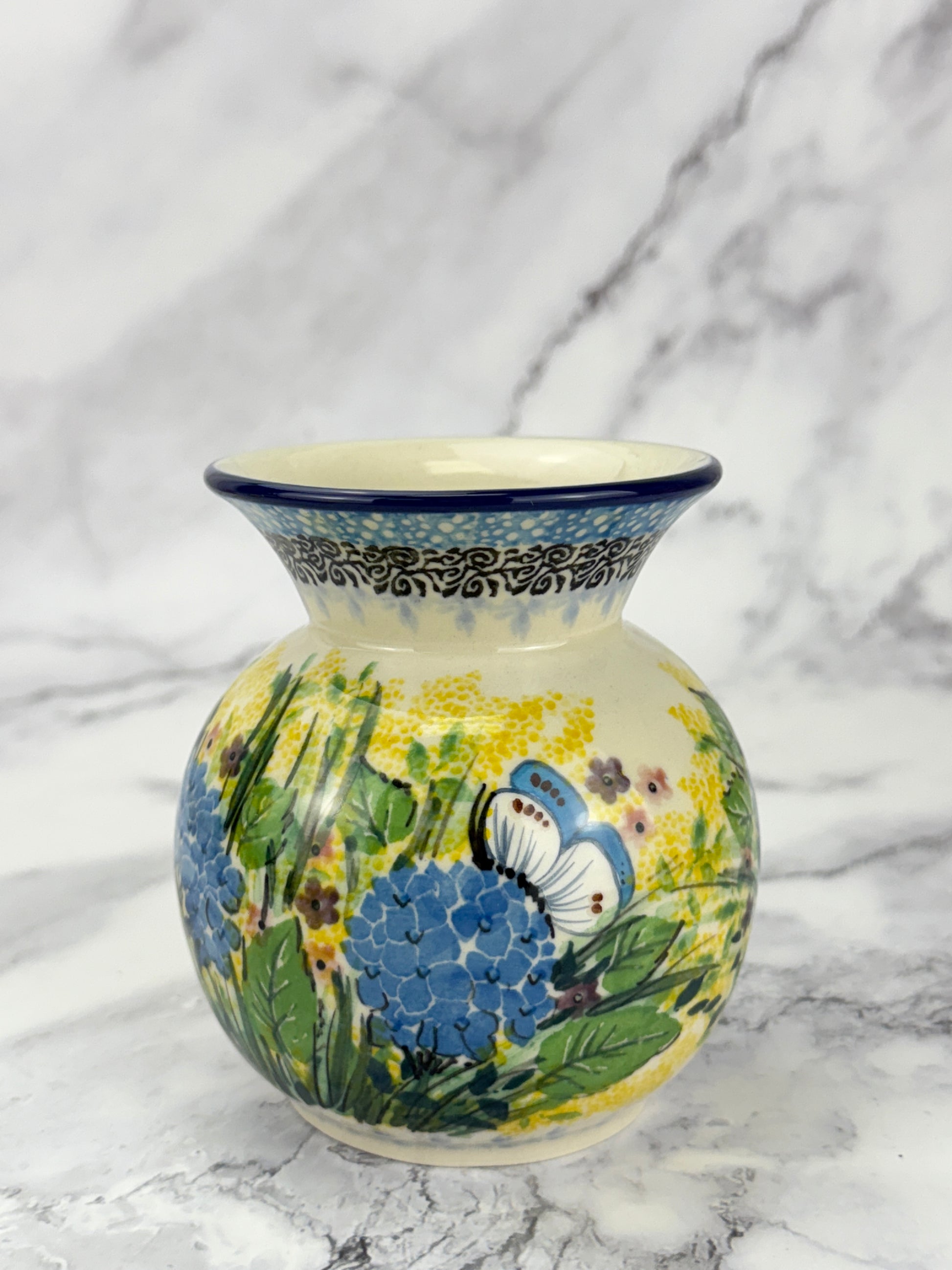 A sweet bud vase, perfect for flowers plucked fresh from your garden. 4.25" tall, 4" in diameter.