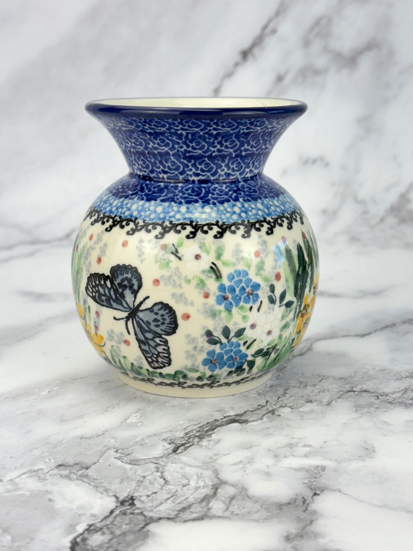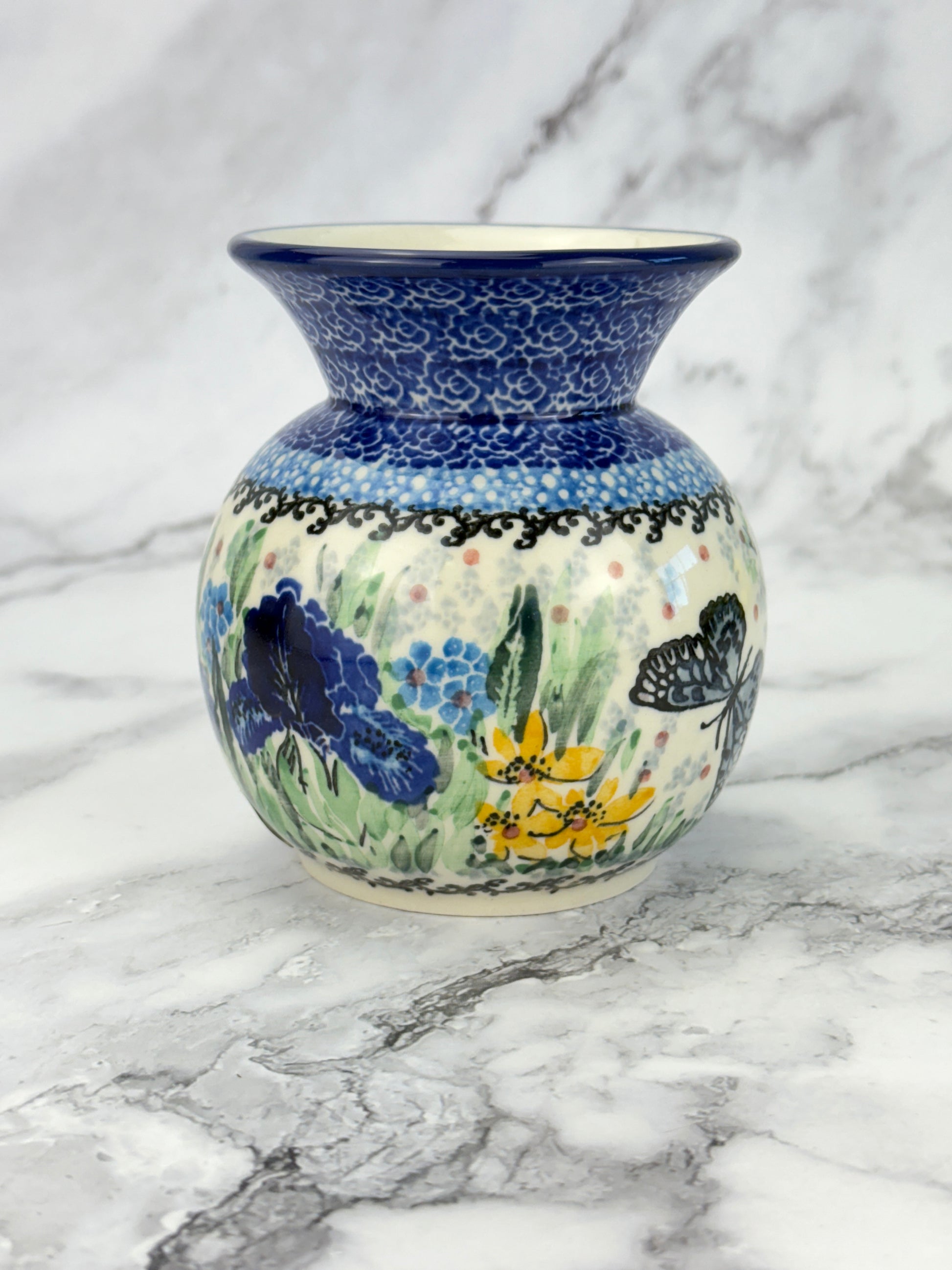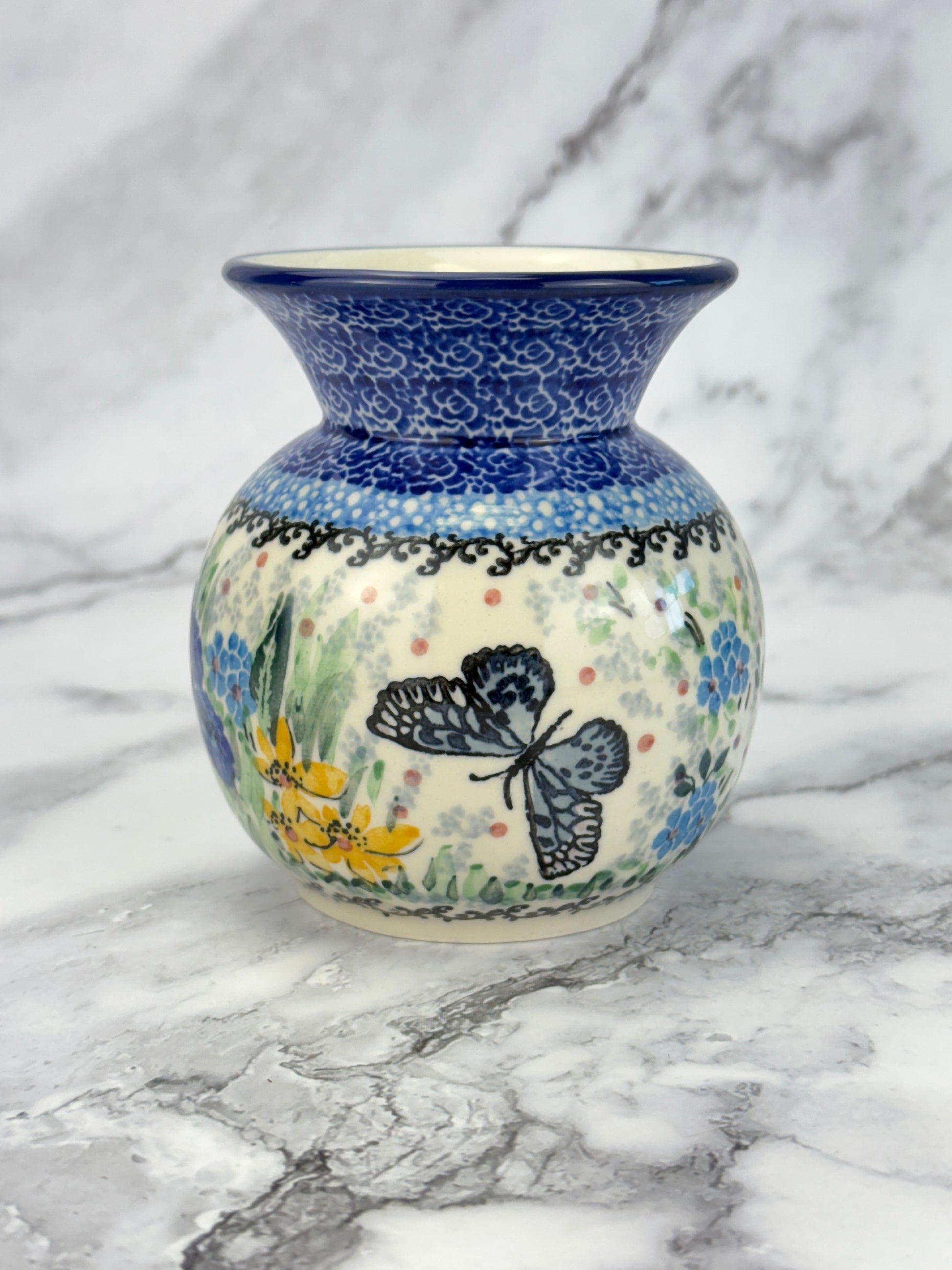 A sweet bud vase, perfect for flowers plucked fresh from your garden. 4.25" tall, 4" in diameter.