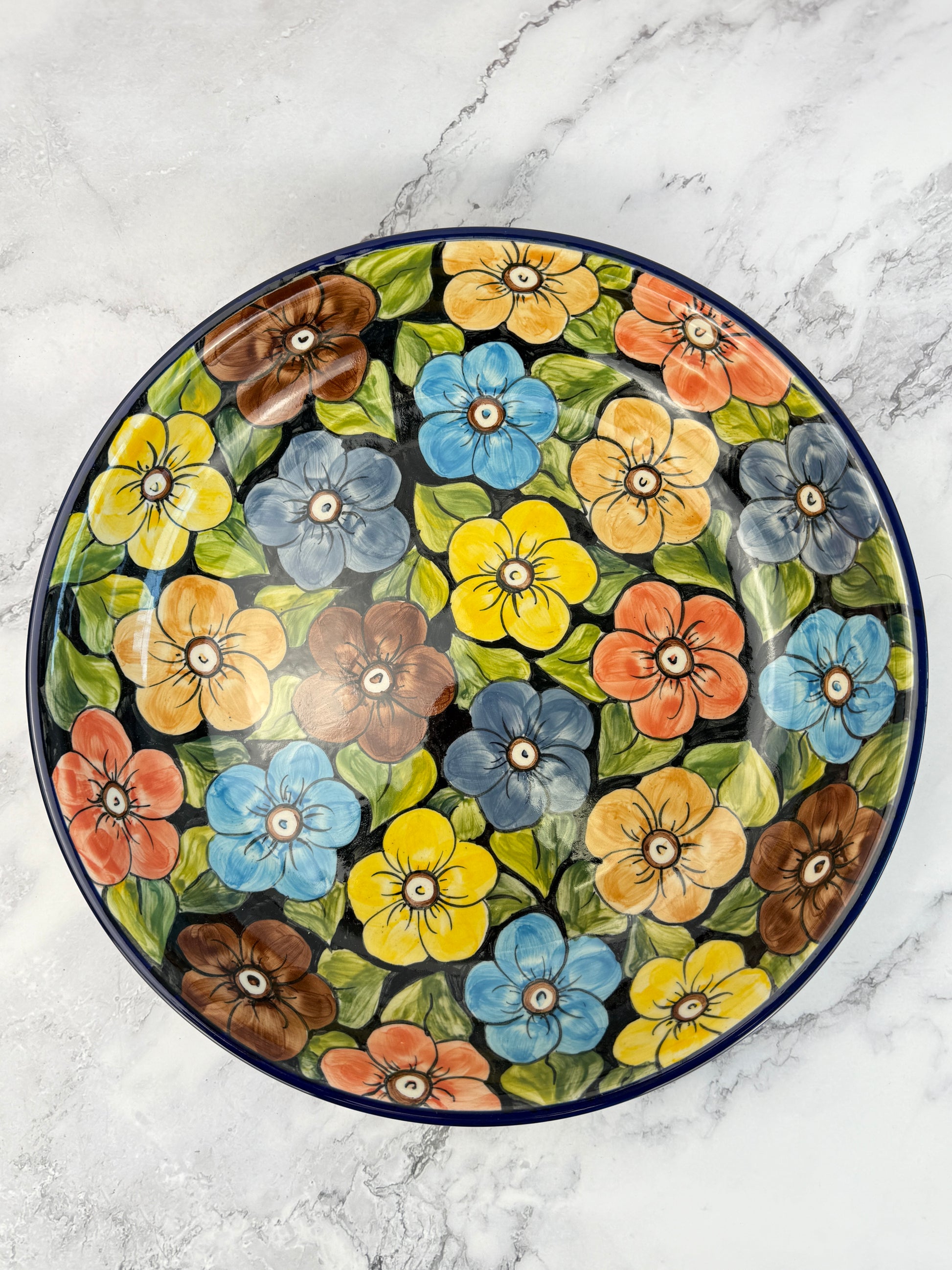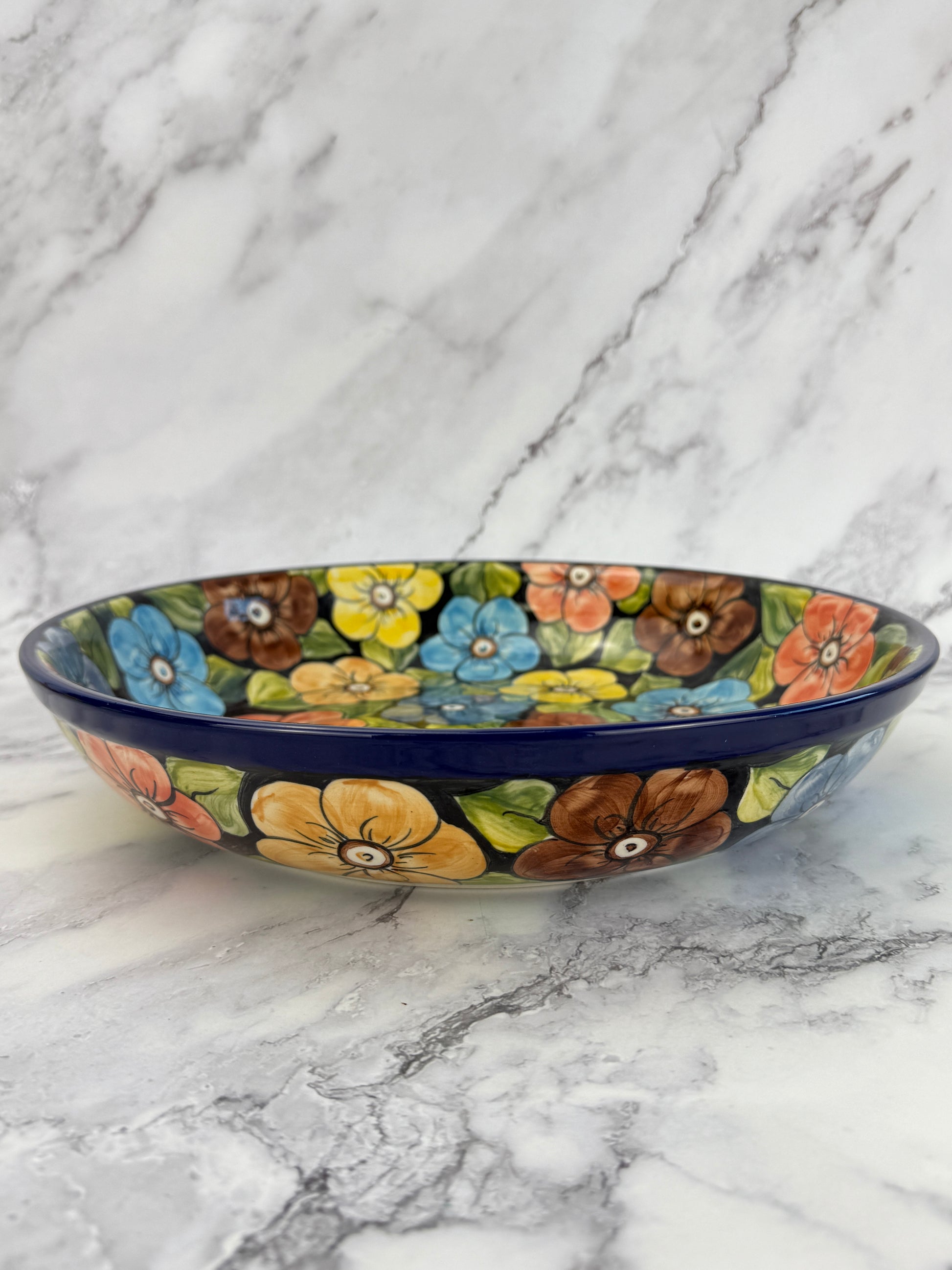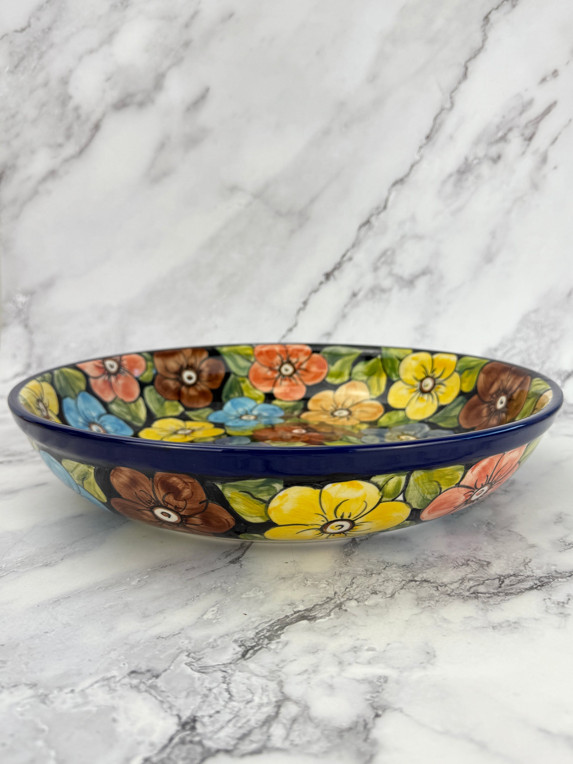 This gorgeous pasta server / bowl has a 12.75" diameter and is 2.5" deep.