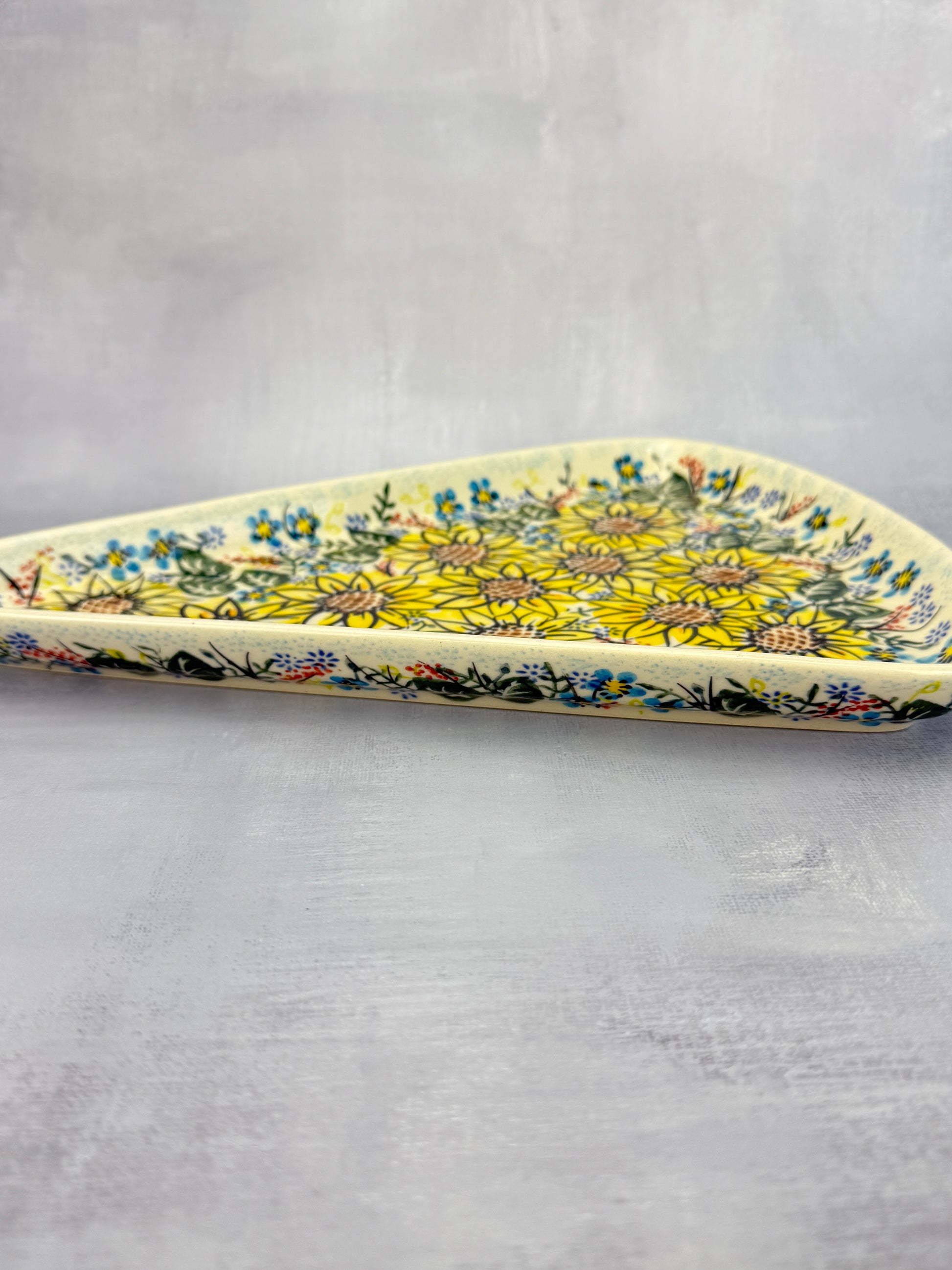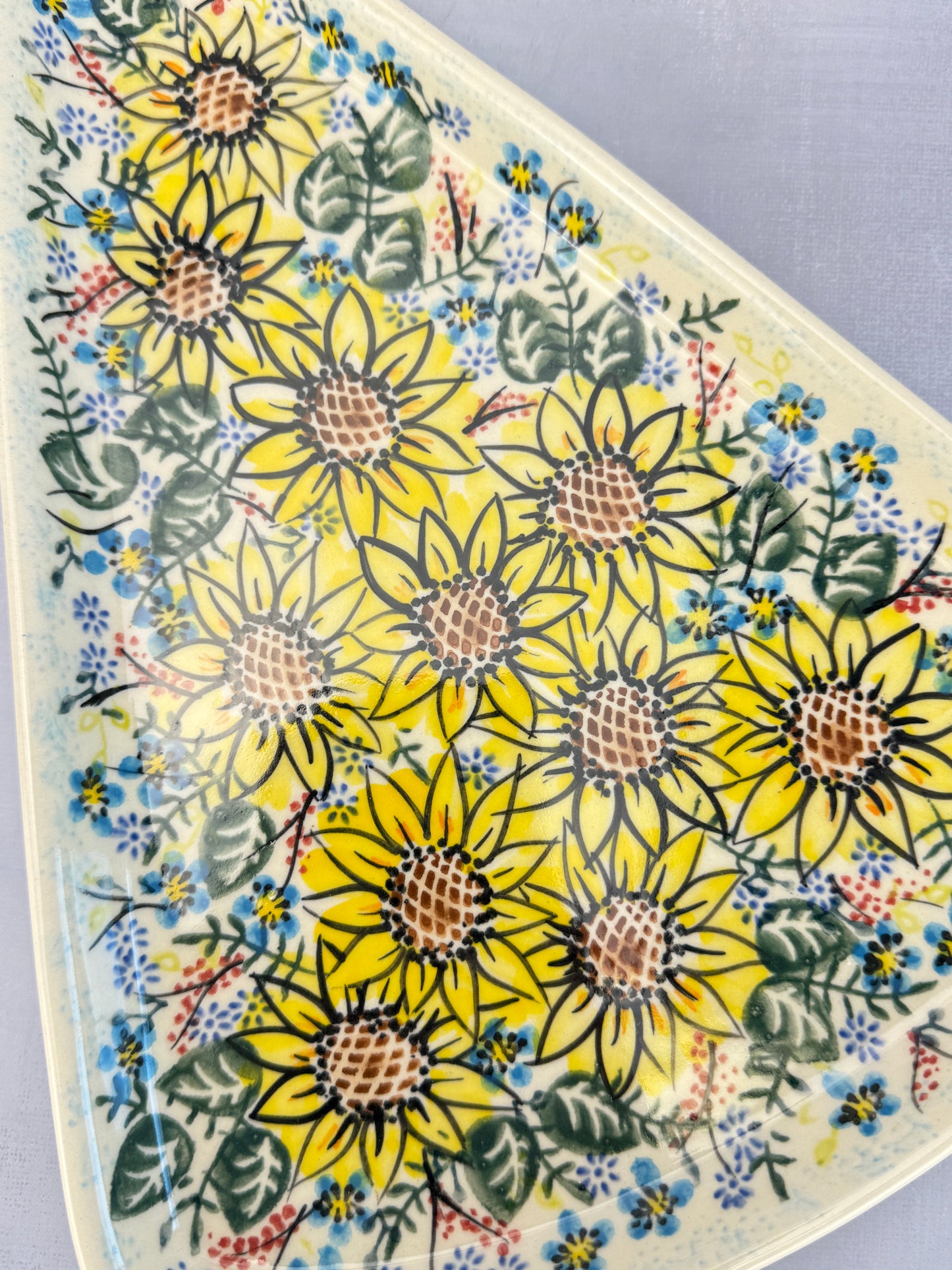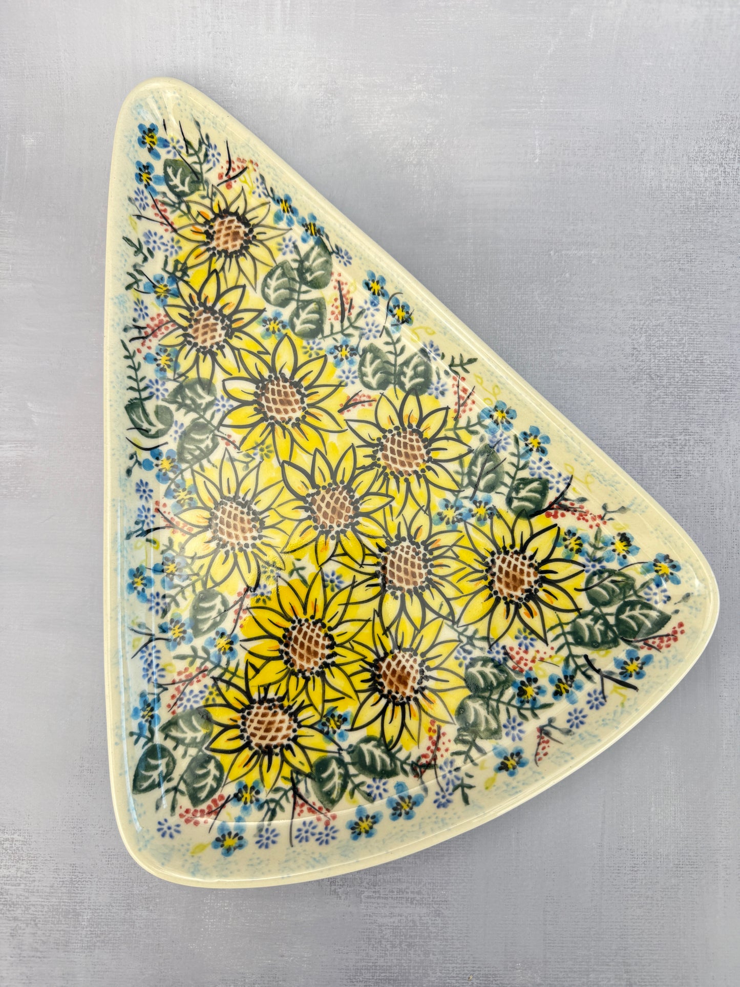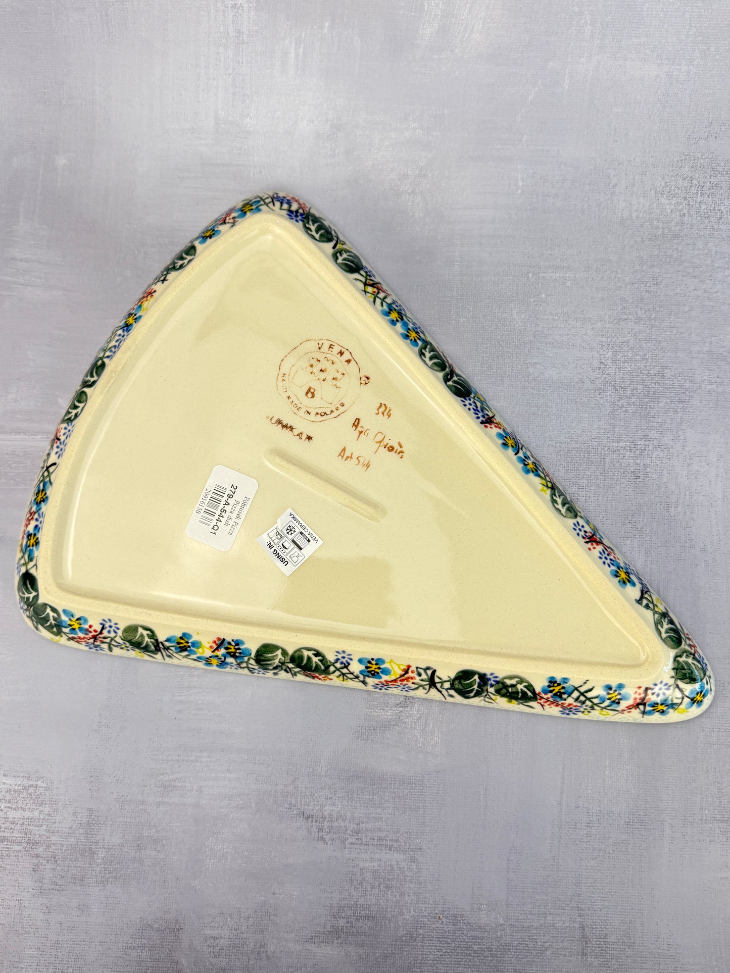 A gorgeous triangular pizza plate. Perfect for an XL slice of pizza, or as a unique serving dish. 11.75" long, 8.75" wide at the widest point, and 1.5" wide at the tip.