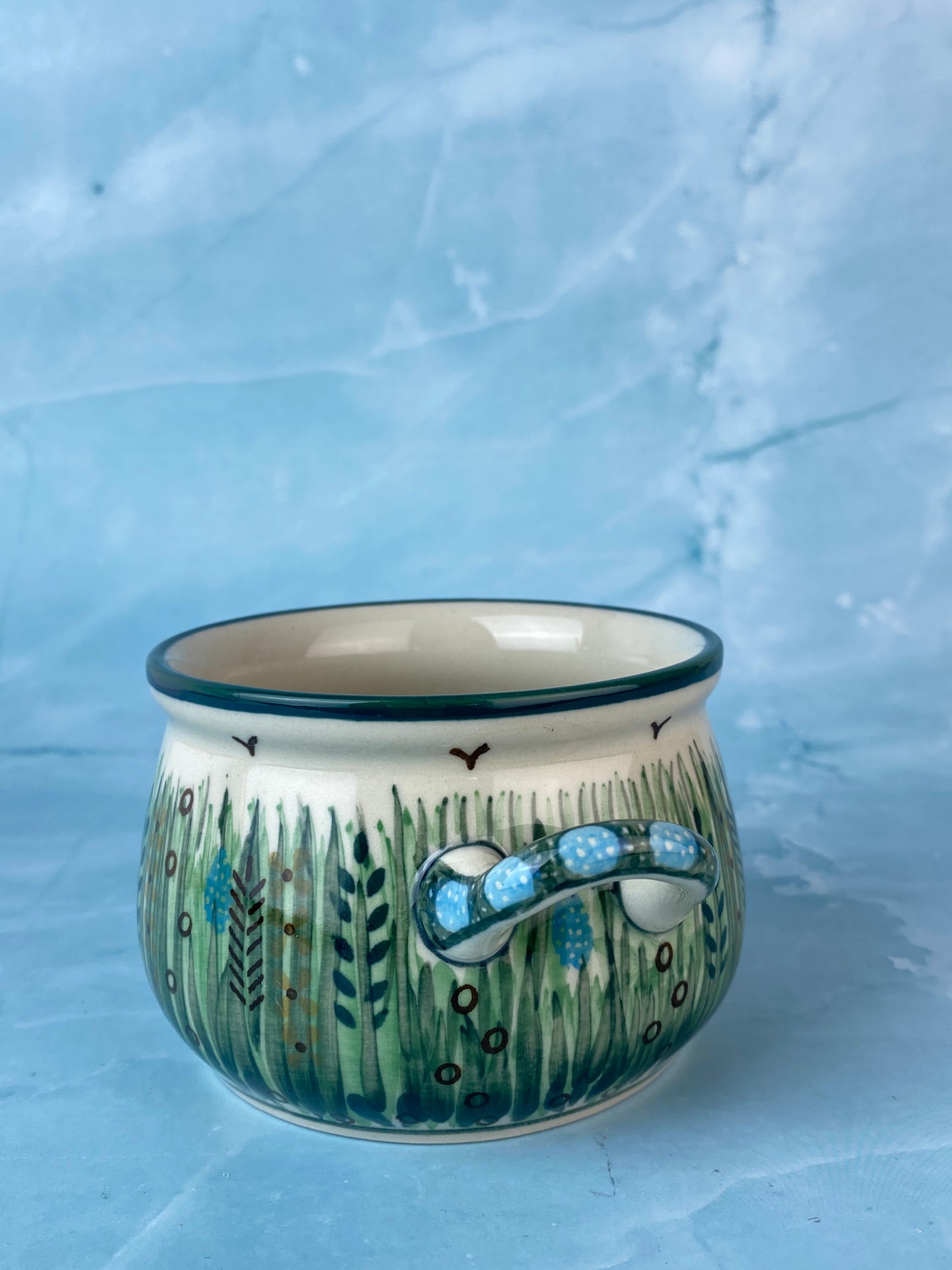 A lovely little 12oz soup crock. This cute soup crock would make the perfect home for French onion soup, or just good old chicken noodle. It has a 4" diameter (excluding handles) and is 2.6" deep.