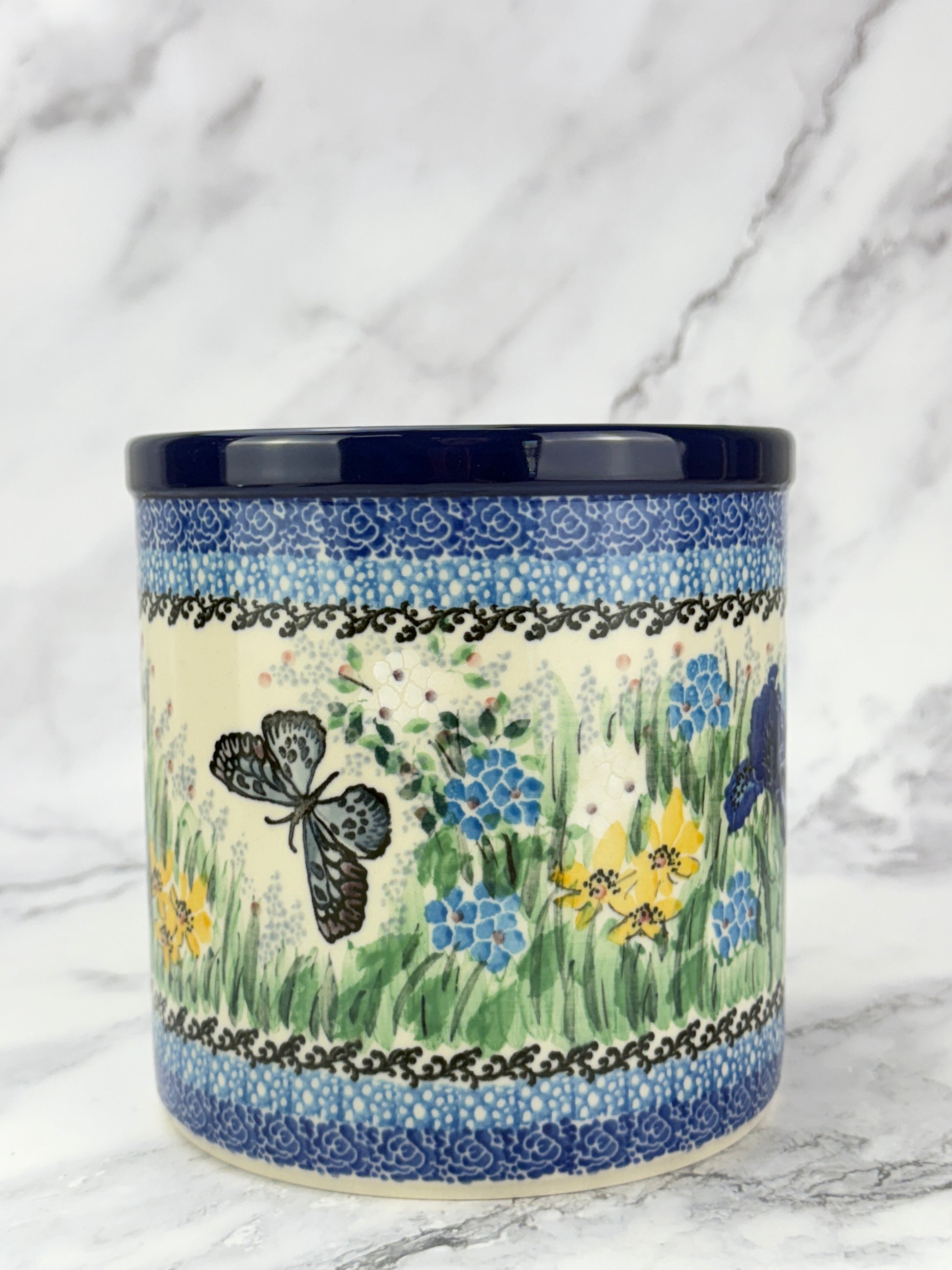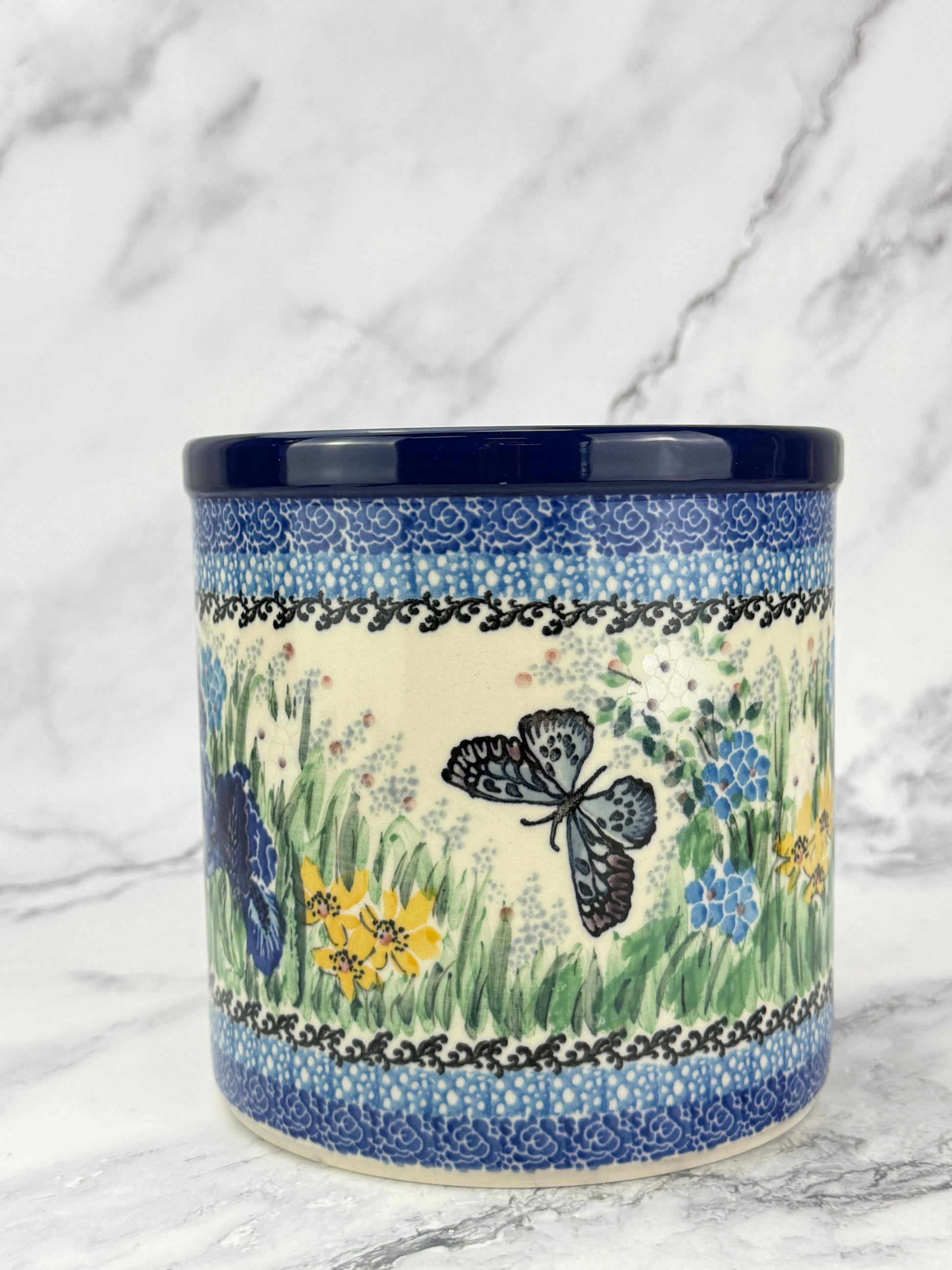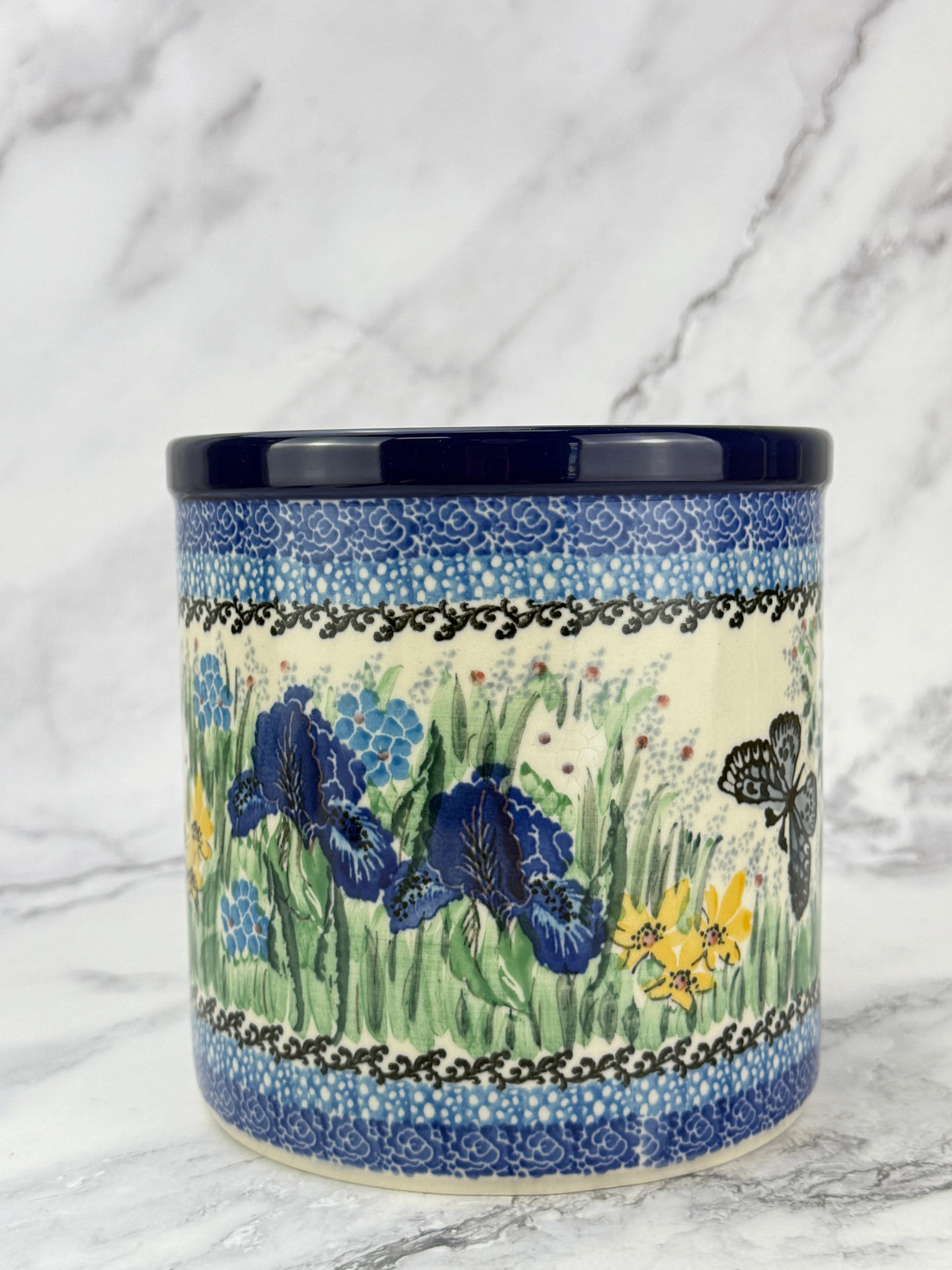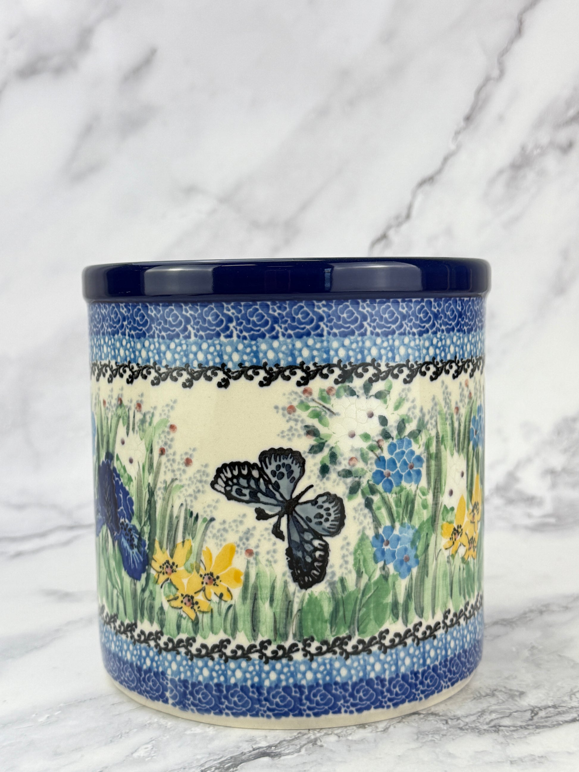 This hand-painted utensil crock is a multi-functional item perfect for storing utensils, using as a planter or wine cooler. Its unique design and quality craftsmanship make an attractive addition to your kitchen.