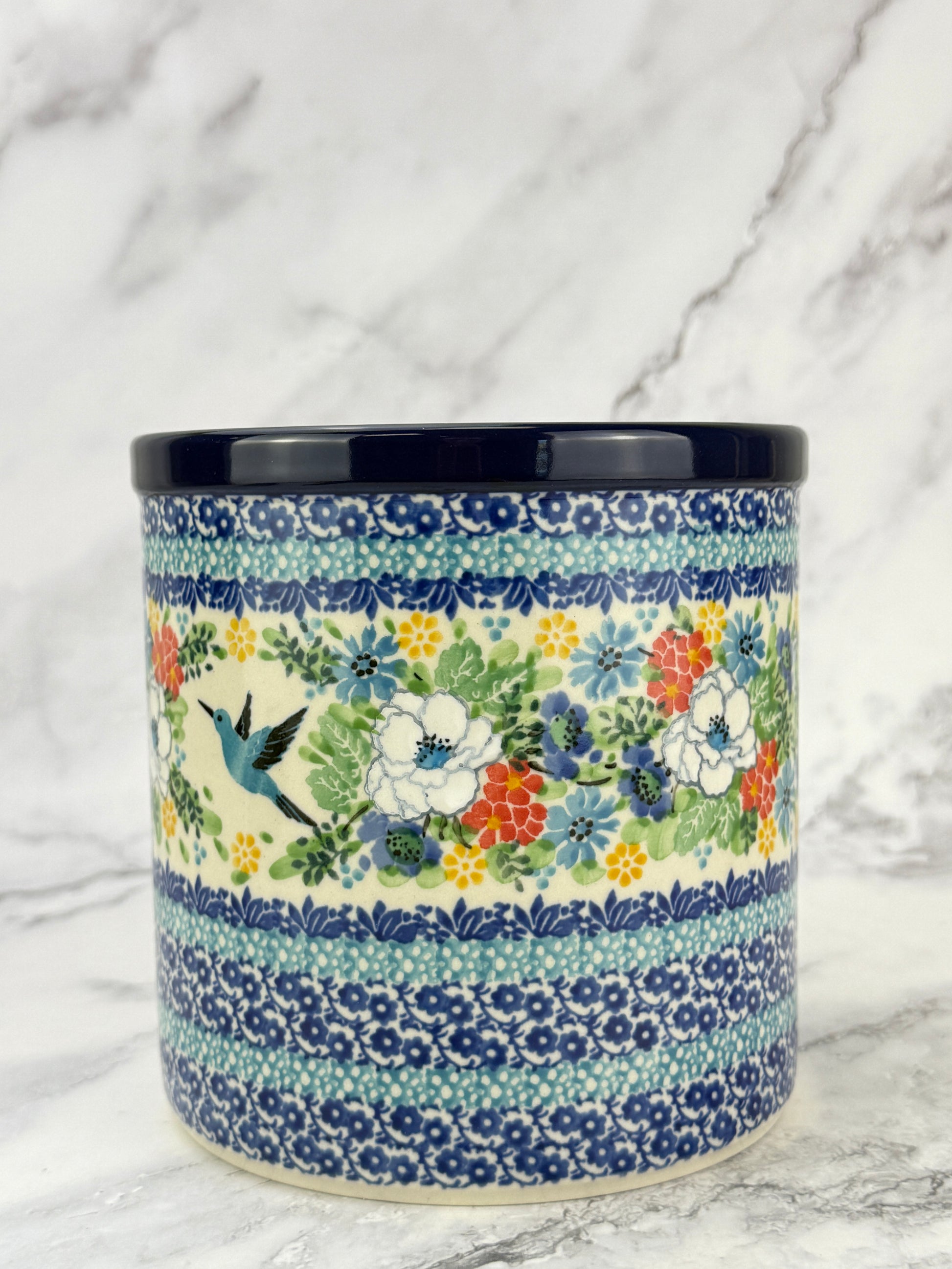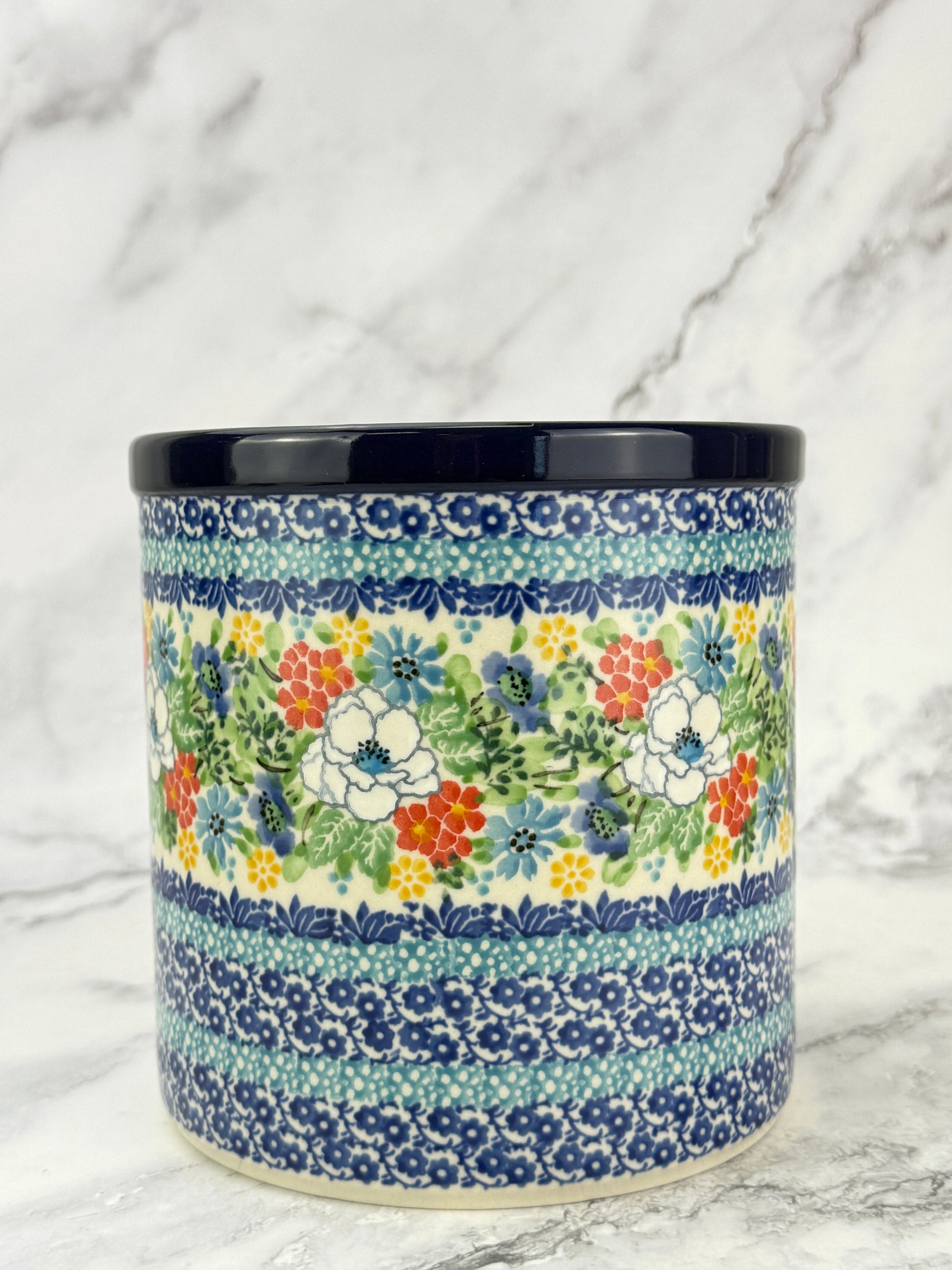 This hand-painted utensil crock is a multi-functional item perfect for storing utensils, using as a planter or wine cooler. Its unique design and quality craftsmanship make an attractive addition to your kitchen.