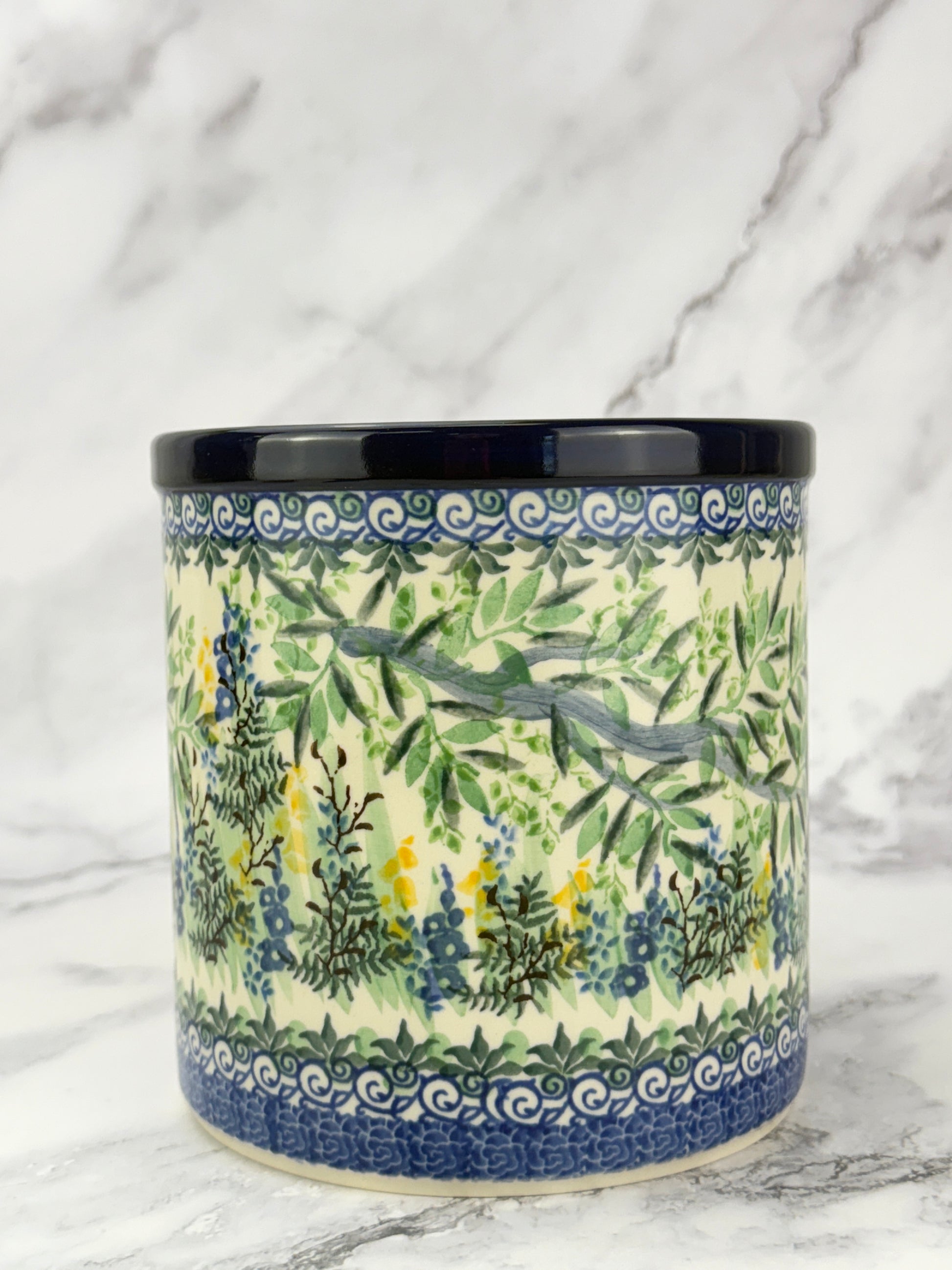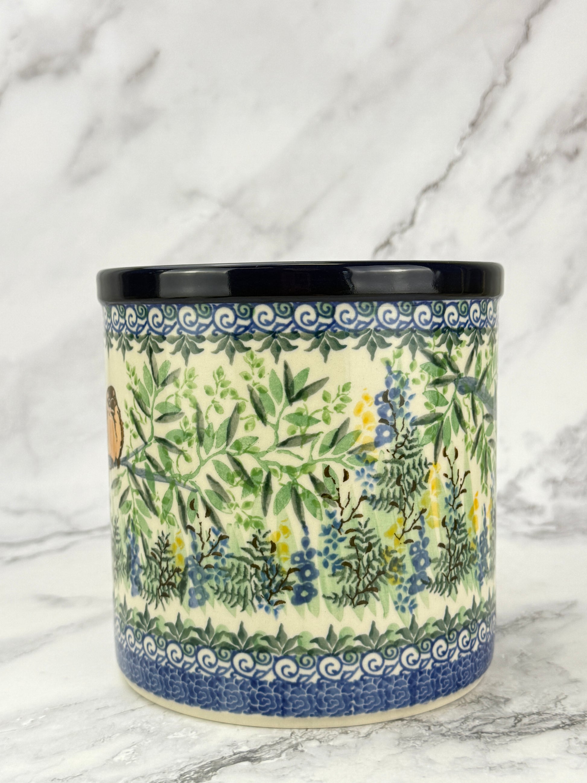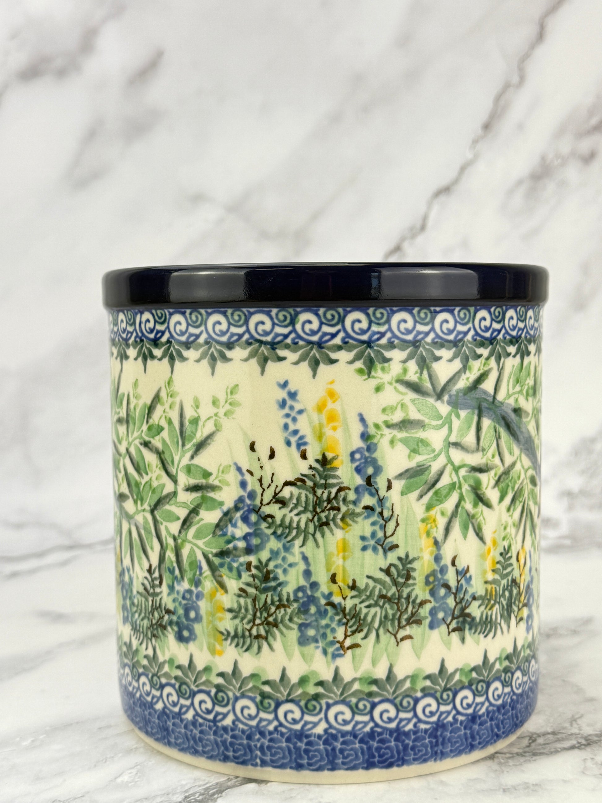 This hand-painted utensil crock is a multi-functional item perfect for storing utensils, using as a planter or wine cooler. Its unique design and quality craftsmanship make an attractive addition to your kitchen.