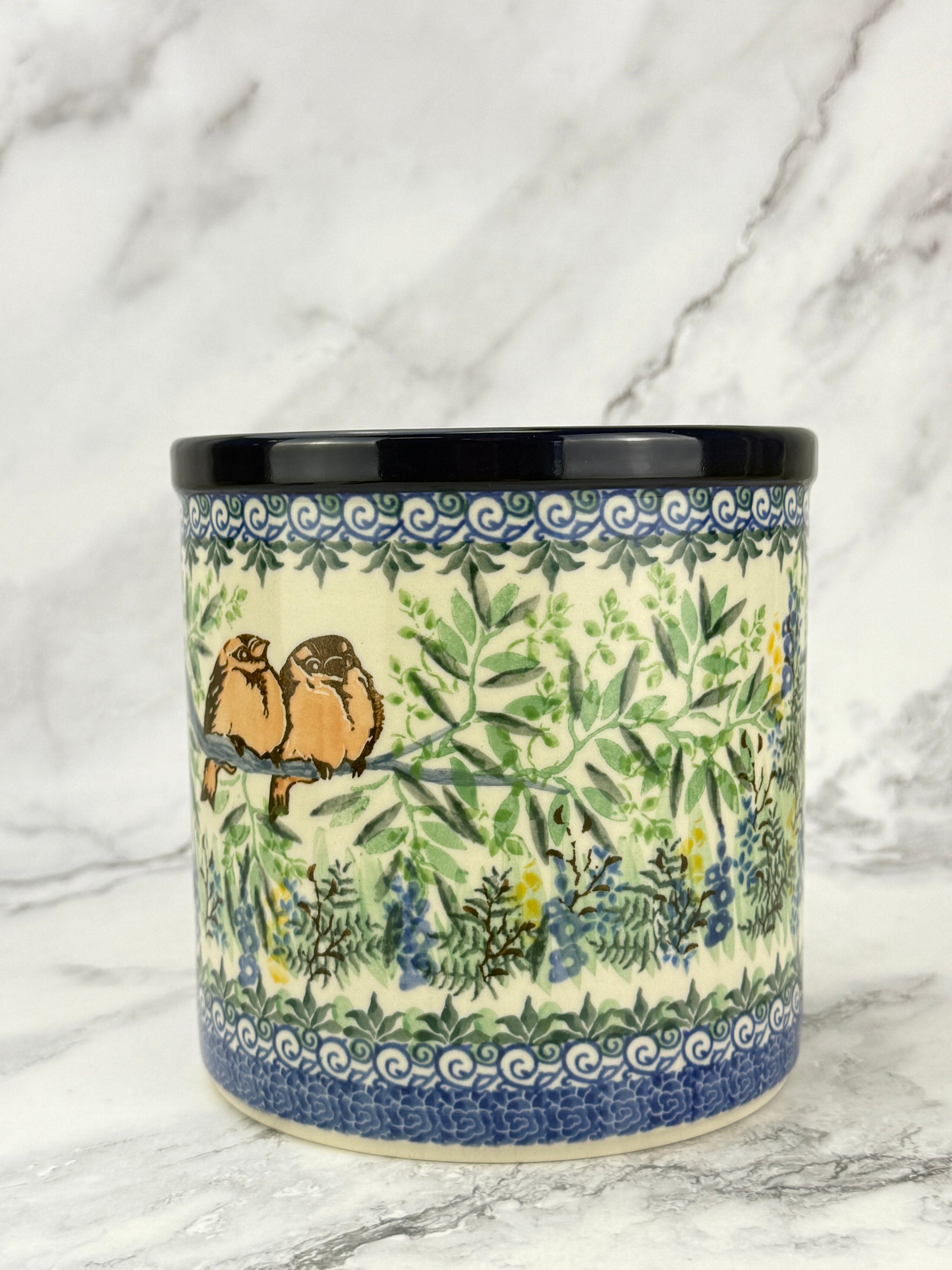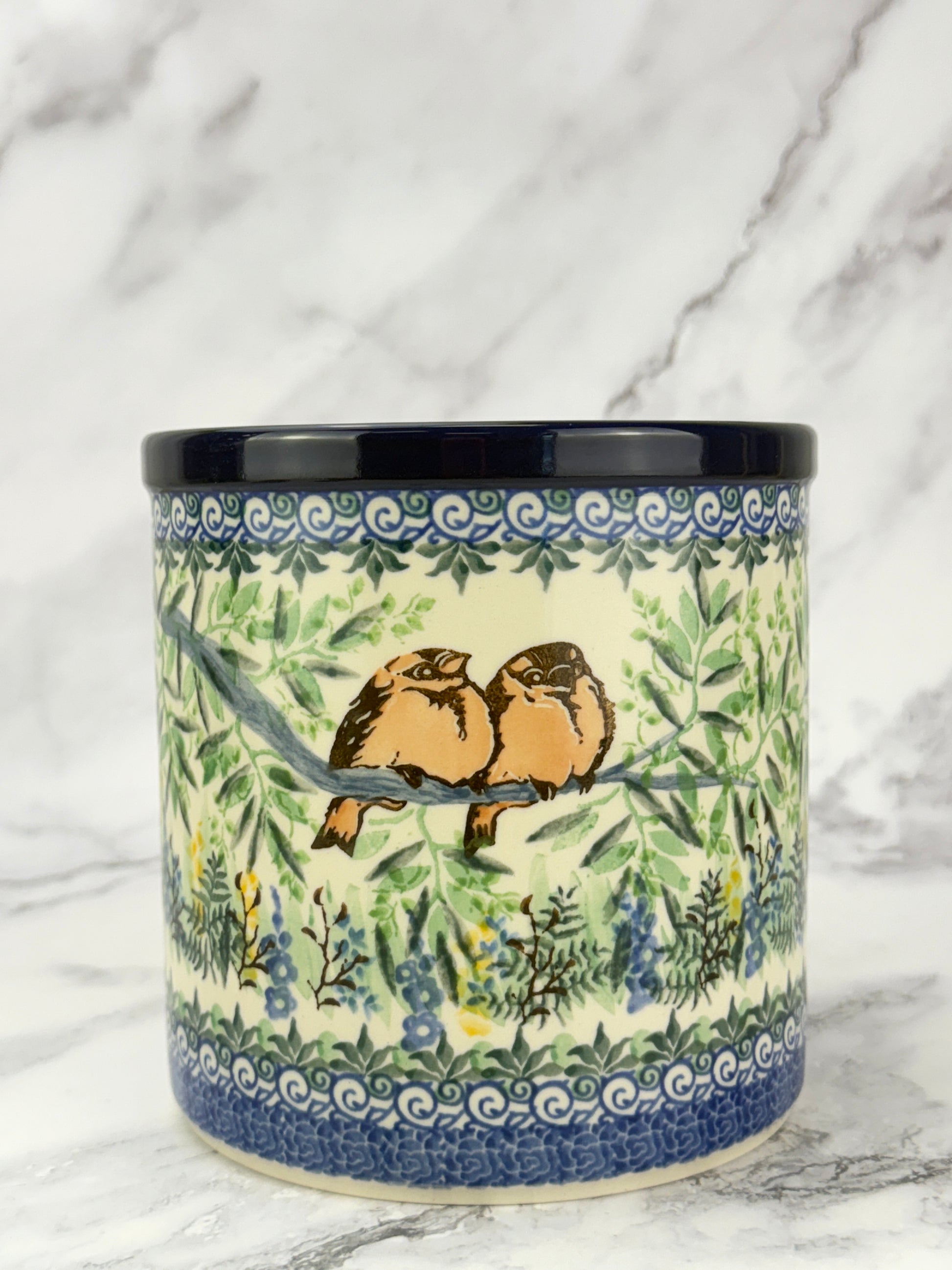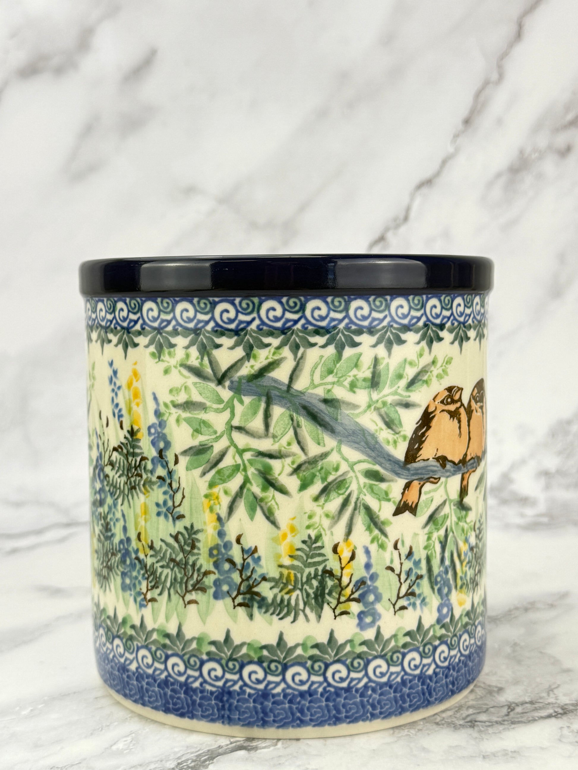 This hand-painted utensil crock is a multi-functional item perfect for storing utensils, using as a planter or wine cooler. Its unique design and quality craftsmanship make an attractive addition to your kitchen.